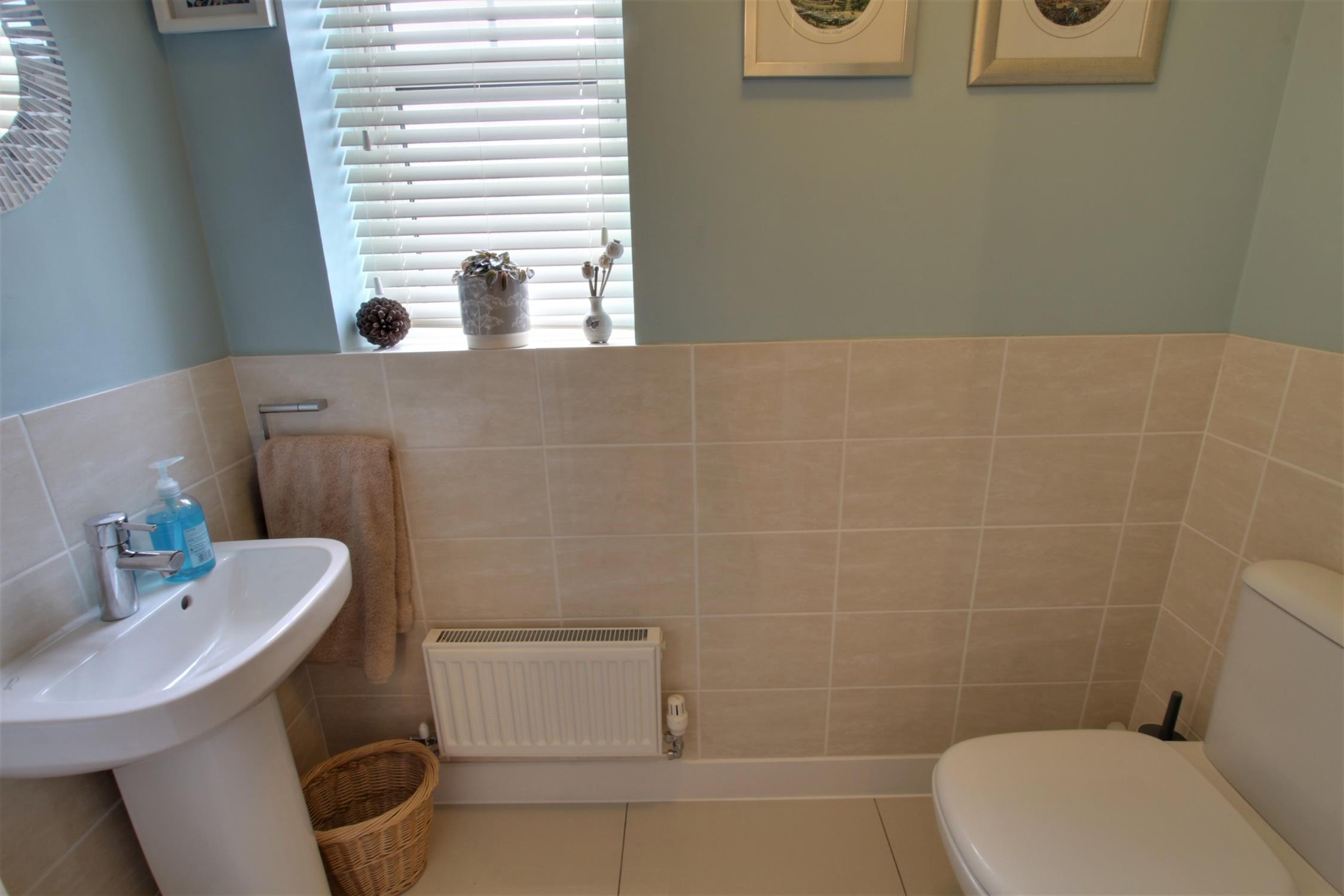 Opaque double glazed window to side, pedestal hand basin, low level WC, radiator, tiled flooring and half height tiled walls,.