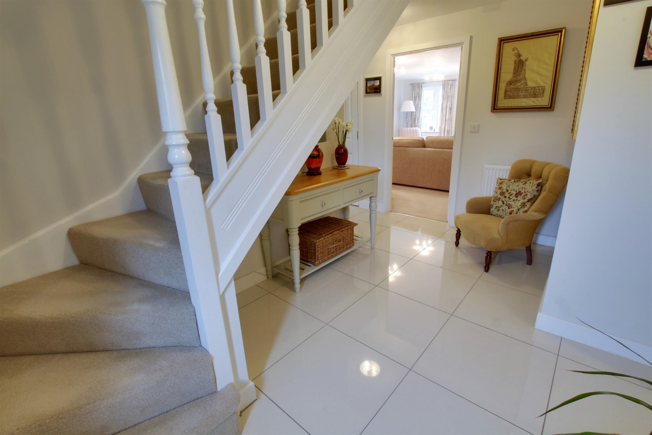 Opaque double glazed front door, tiled flooring with inset door mat, radiator, stairs to first floor landing, storage cupboard.