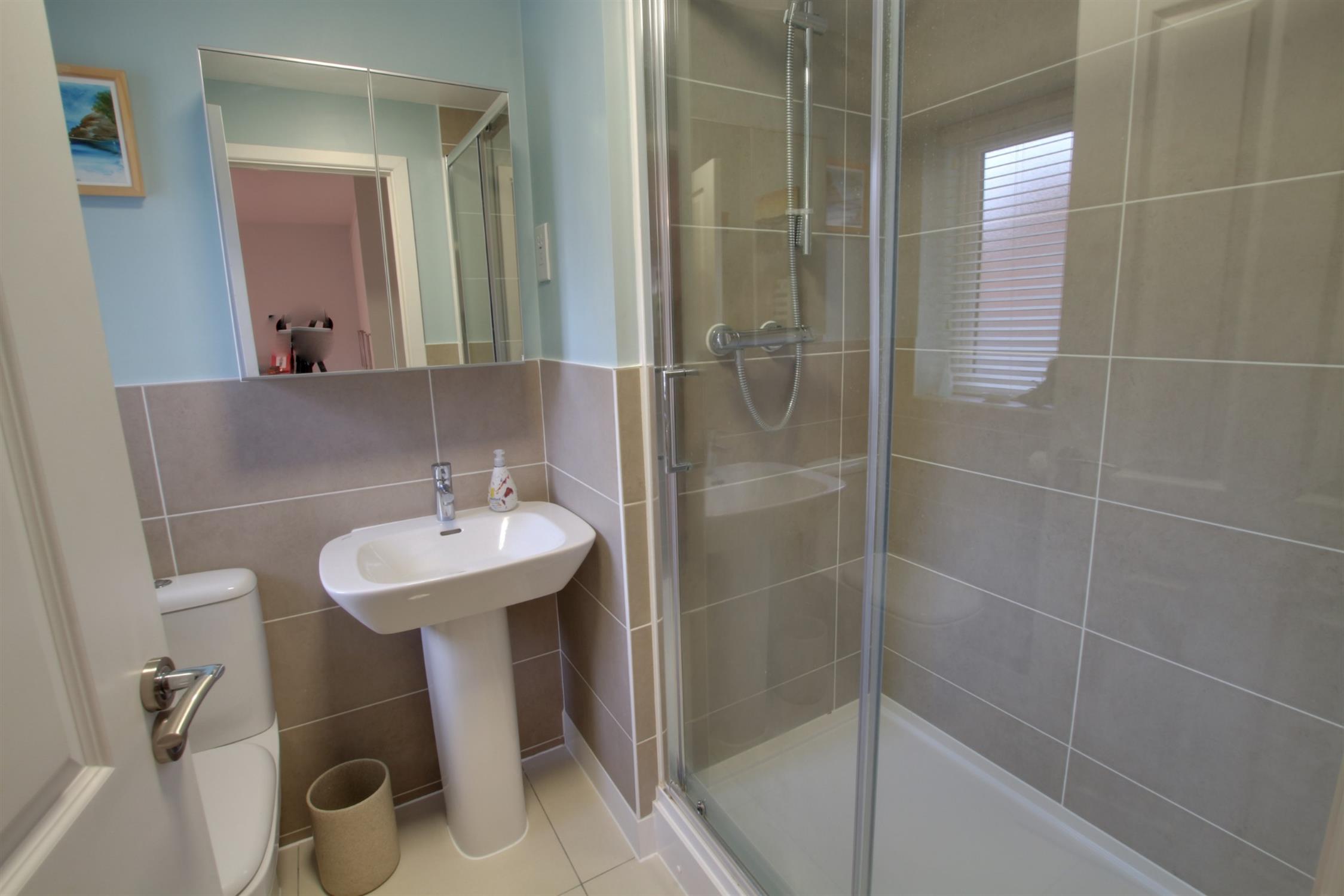 Opaque double glazed window to rear suite comprising pedestal hand basin, low level WC, tiled double shower cubicle, towel radiator, tiled floor and walls to appropriate areas, ceiling extractor.