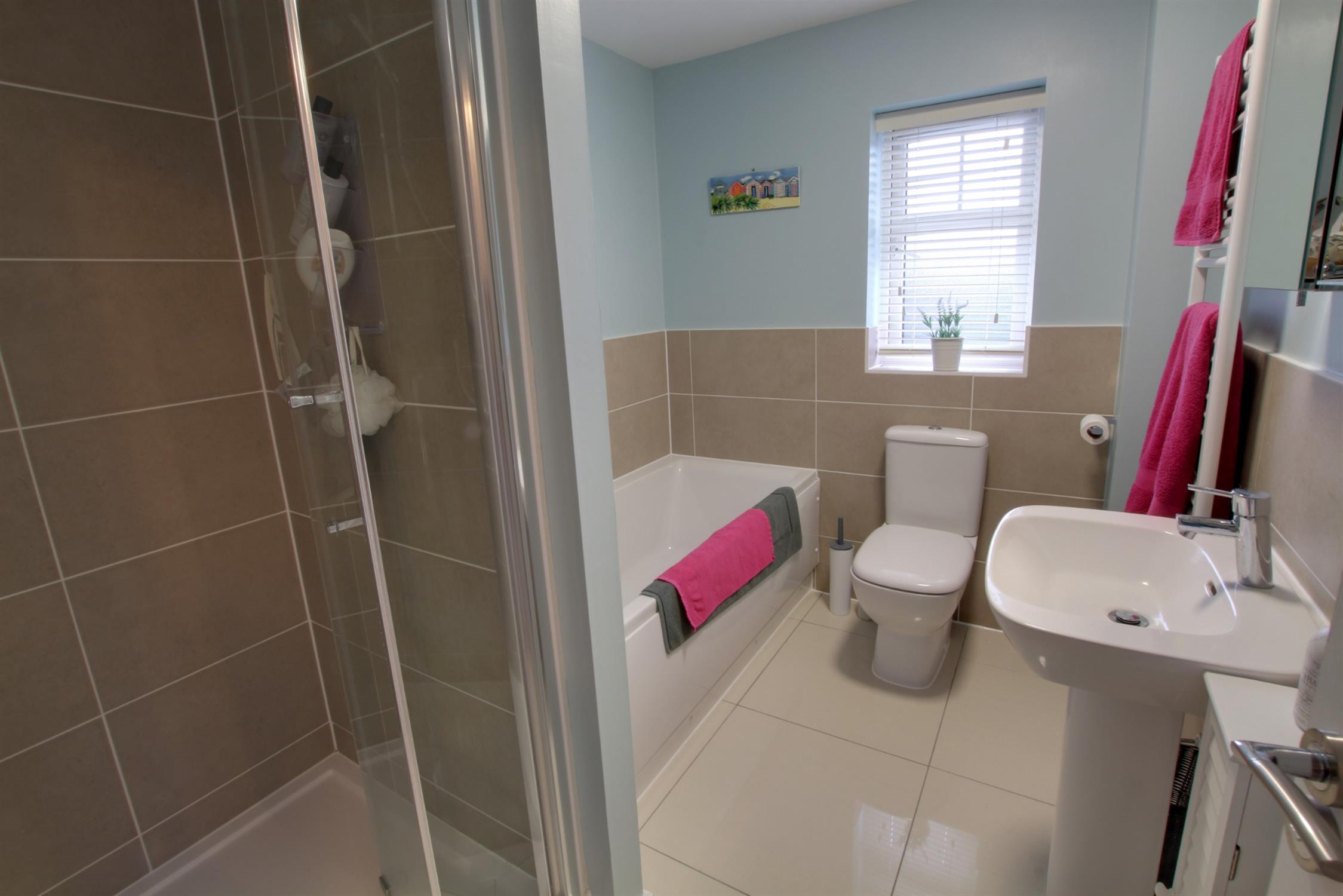 Opaque double glazed window to front, suite comprising pedestal hand basin, low level WC, panel enclosed bath, separate tiled shower cubicle, tiled floor and walls to appropriate areas, radiator, ceiling extractor.