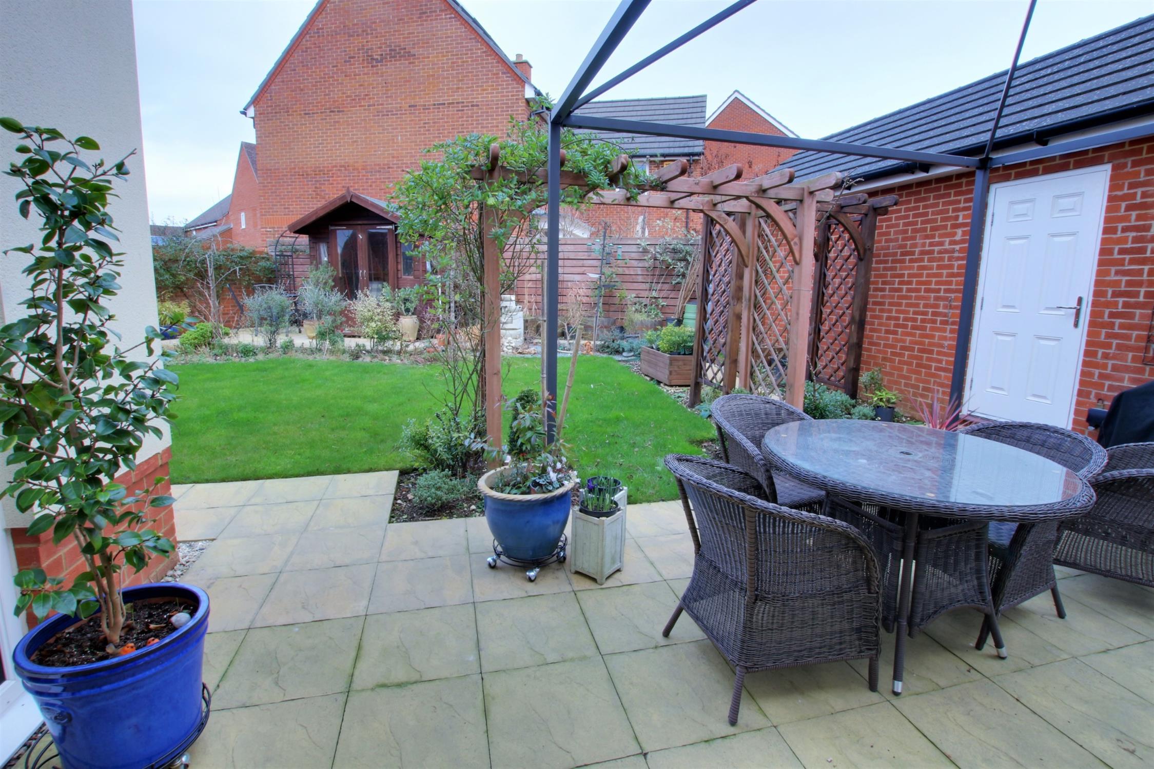 Part brick wall and part timber fence panel enclosed, paved patio areas, raised timber planters, lawn with flowering shrubs, timber pergola and arch, outside tap, side gate offering access to driveway.