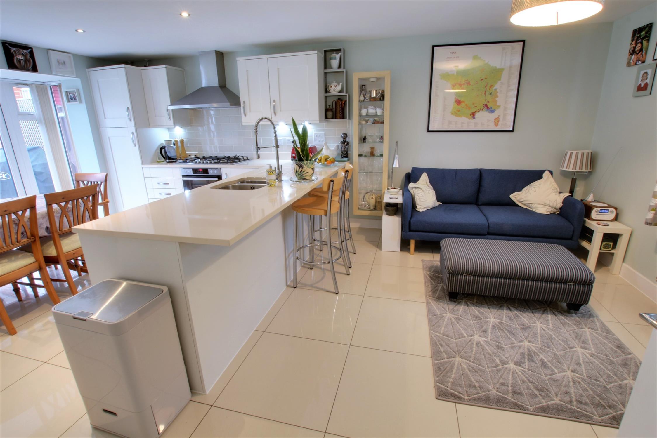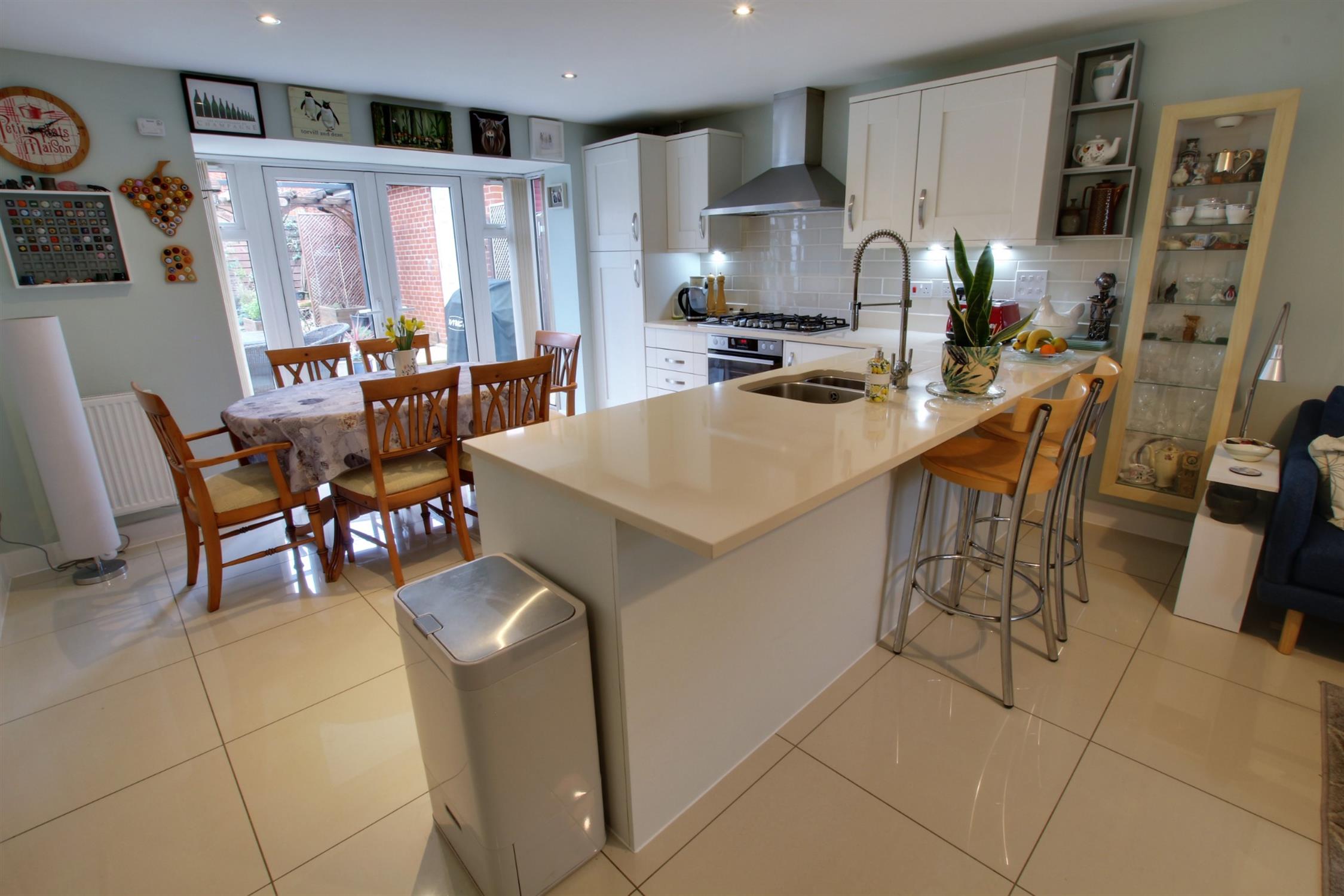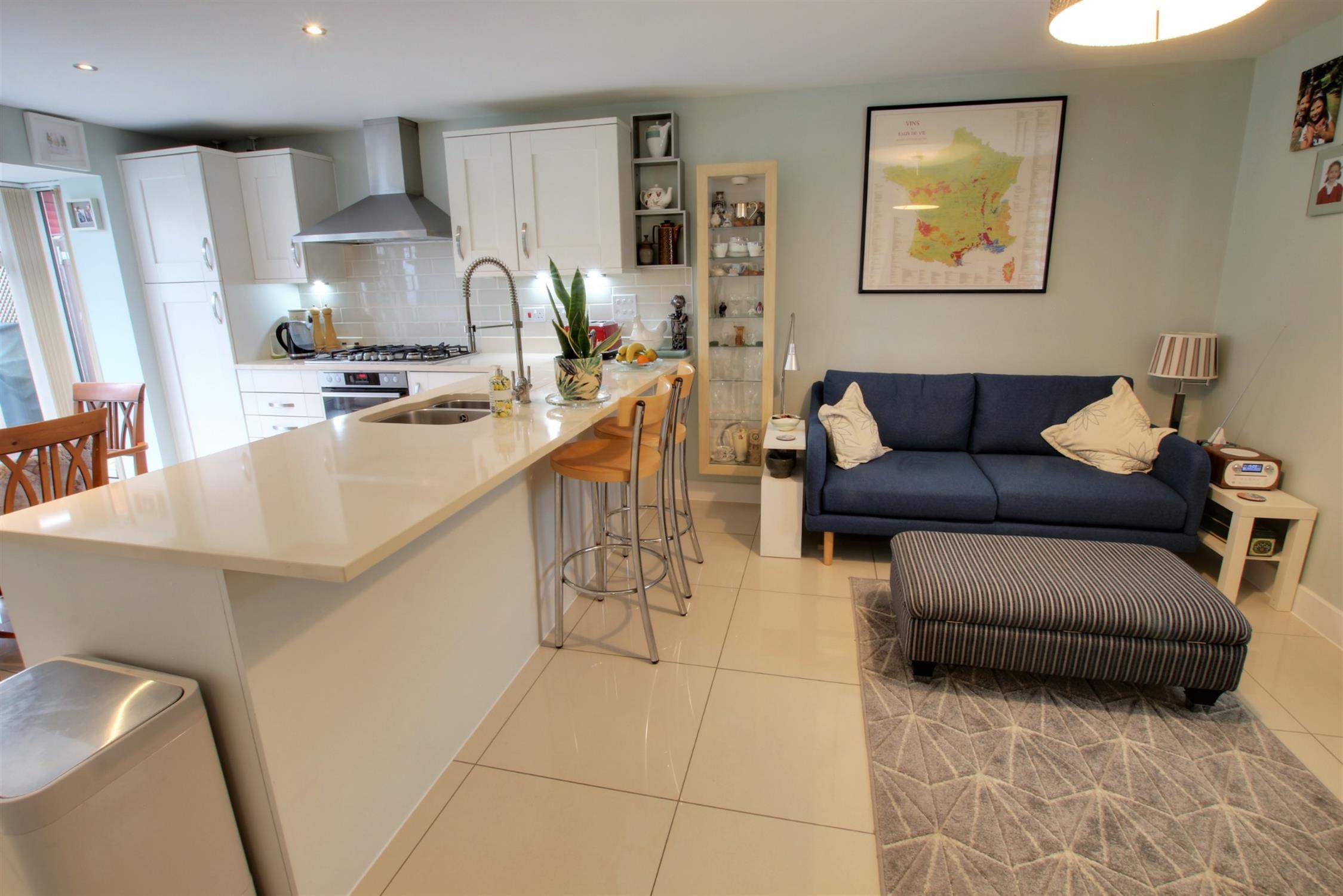 Double glazed windows to front, double glazed box bay windows to rear with double glazed French doors to garden. Modern range of matching wall and base units with undermounted stainless steel one and a quarter bowl sink with worktop drainer grooves, flexi-hose mixer tap, 6 ring gas hob with electric double oven, extractor fan, tiled splashbacks, built in dishwasher, integrated fridge and freezer, breakfast bar, concealed wall mounted combination boiler, tiled flooring.