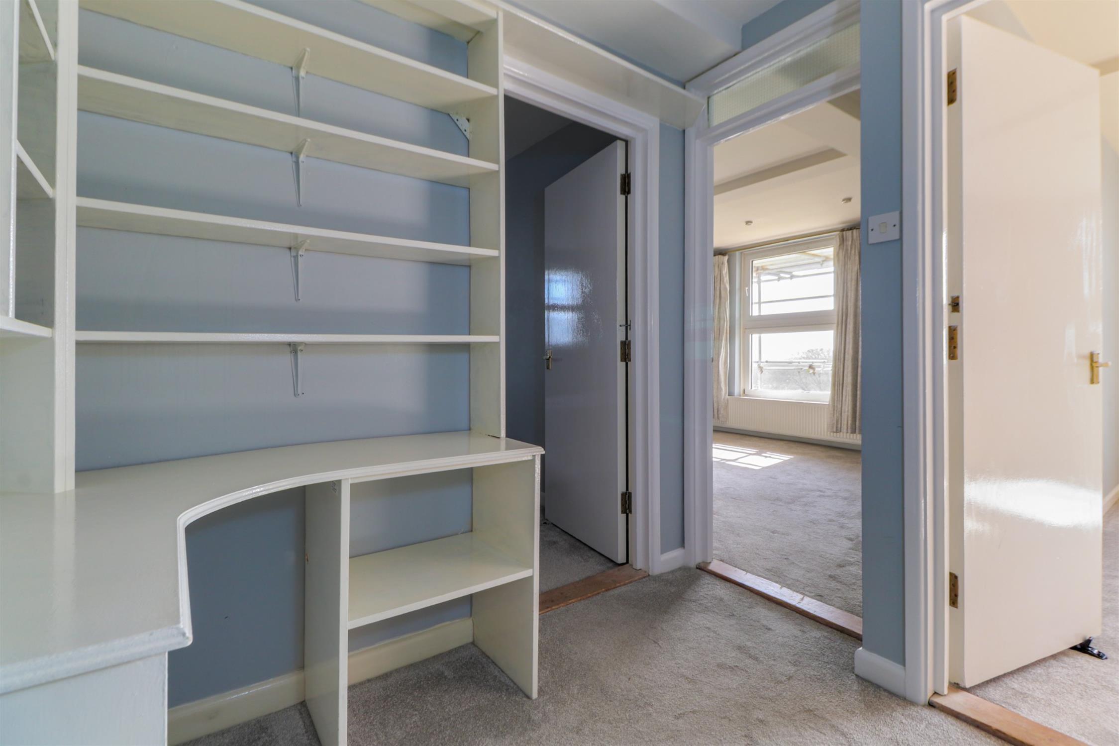 Smooth ceiling, inset spotlights, meter cupboard, radiator, built in shelves and desk, fitted carpet.