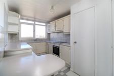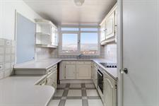 Smooth ceiling, double glazed window with far reaching views across the city of Portsmouth and towards Ports Down Hill, fitted kitchen with wall and base mounted units, work surfaces over, breakfast bar, sink and drainer with mixer tap over, integrated appliances including fridge, electric oven and hob, space for appliances, two pantry cupboards, radiator, part tiled walls, tiled floor.