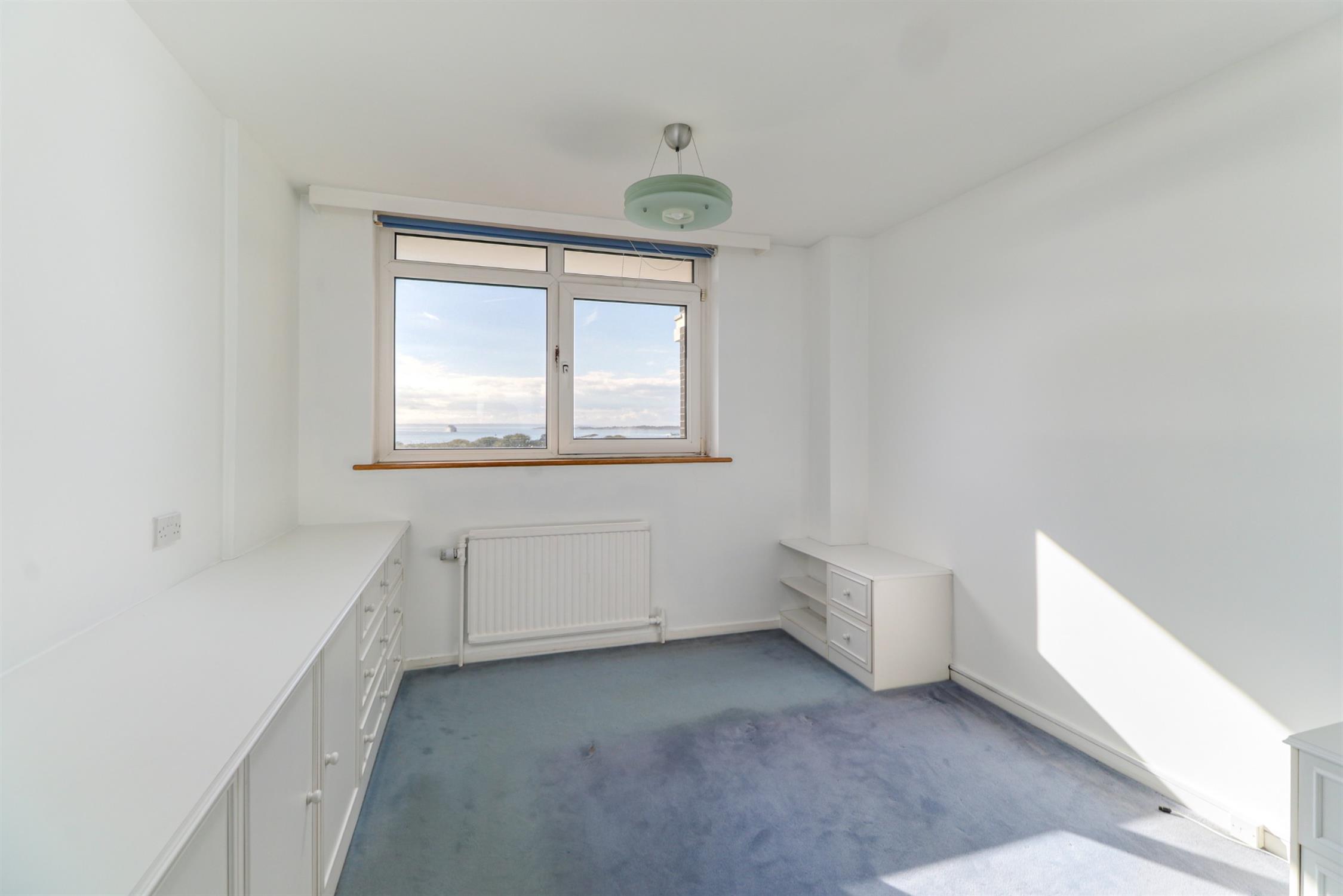 Smooth ceiling, double glazed window with far reaching views over Clarence Parade, tree-lined Southsea Common, into The Solent, and towards the Isle of Wight, range of fitted furniture, radiator, fitted carpet.