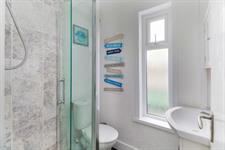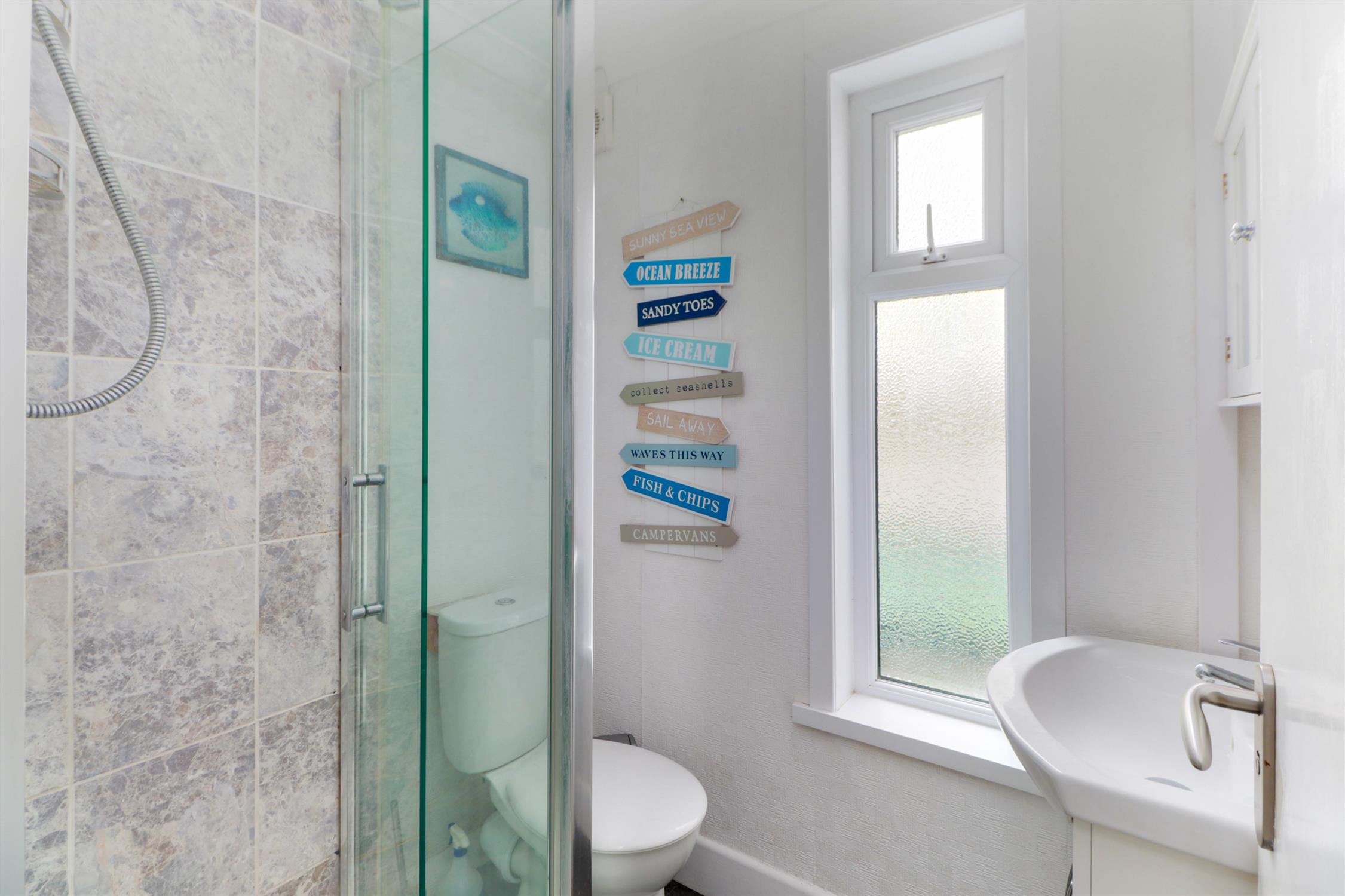 Textured and coved ceiling, obscured UPVC double-glazed window, enclosed shower cubicle, wash hand basin, low level W.C and vinyl flooring.
