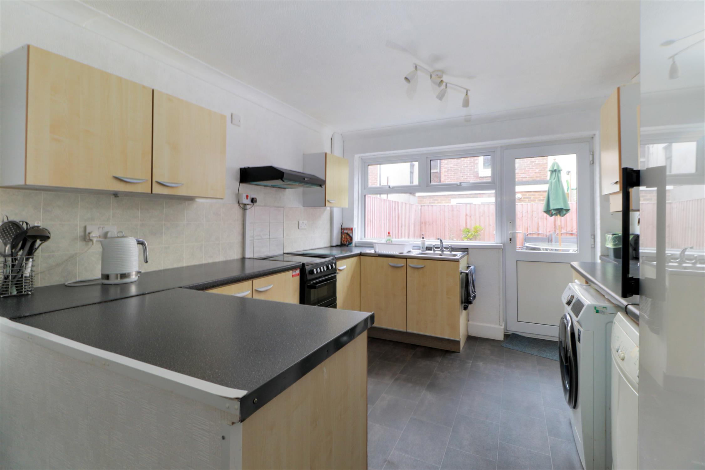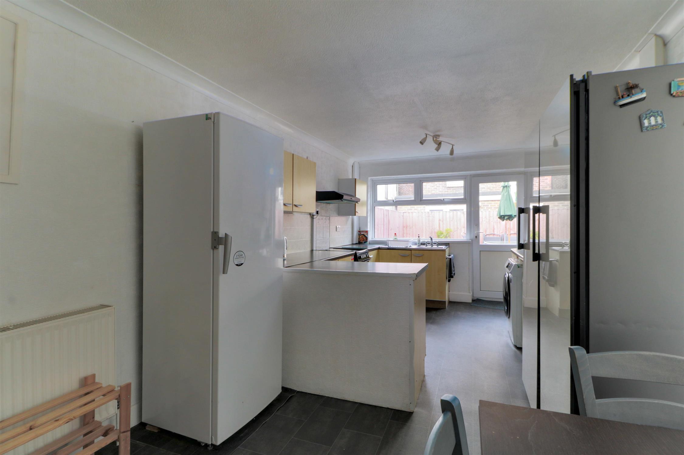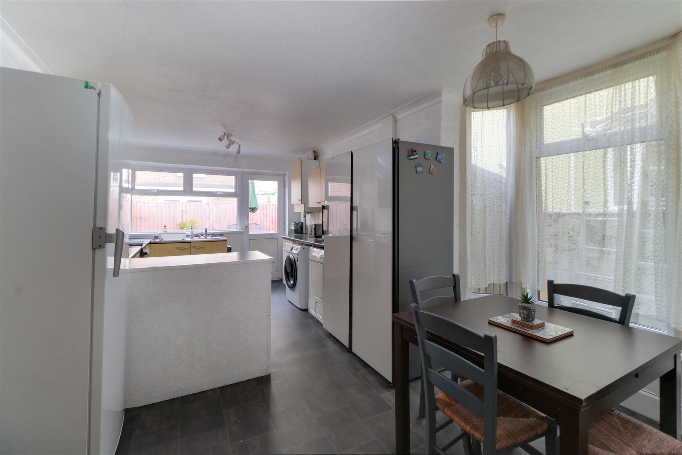 Textured and coved ceiling, UPVC double-glazed side aspect bay window, UPVC double-glazed windows and door to garden, a range of wall and base mounted units with work surfaces over inset sink and drainer, two fridges, freezer, electric cooker with extractor fan, washing machine, dryer and vinyl flooring.