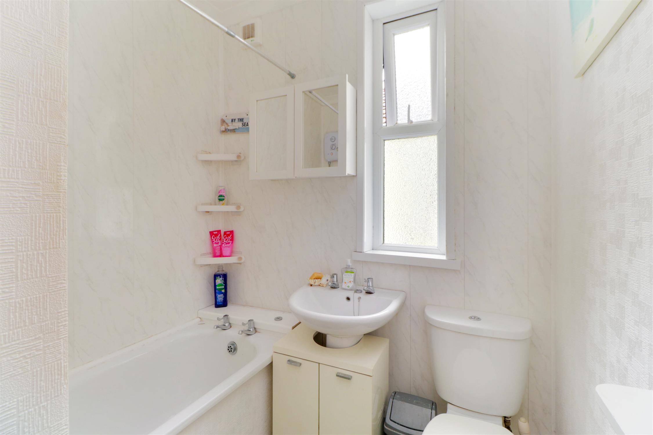 Smooth and coved ceiling, extractor fan, obscured UPVC double-glazed window, panelled bath with shower over, wash hand basin, low level W.C and vinyl flooring.