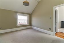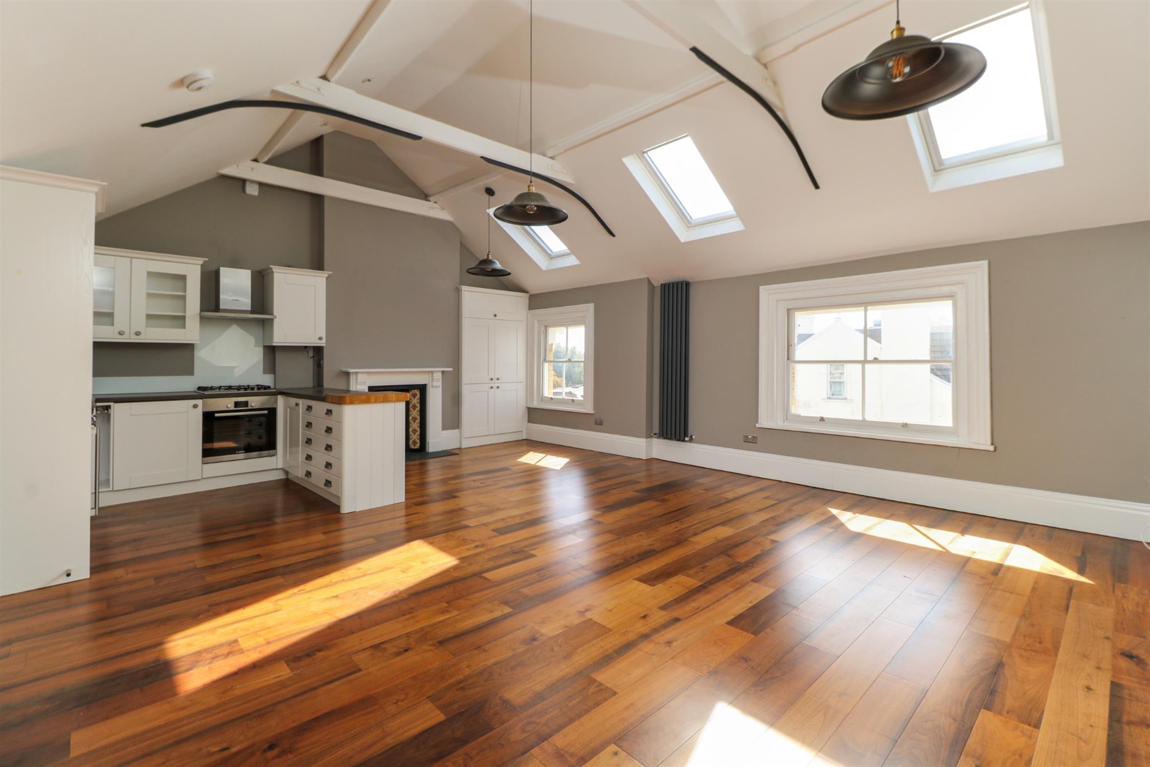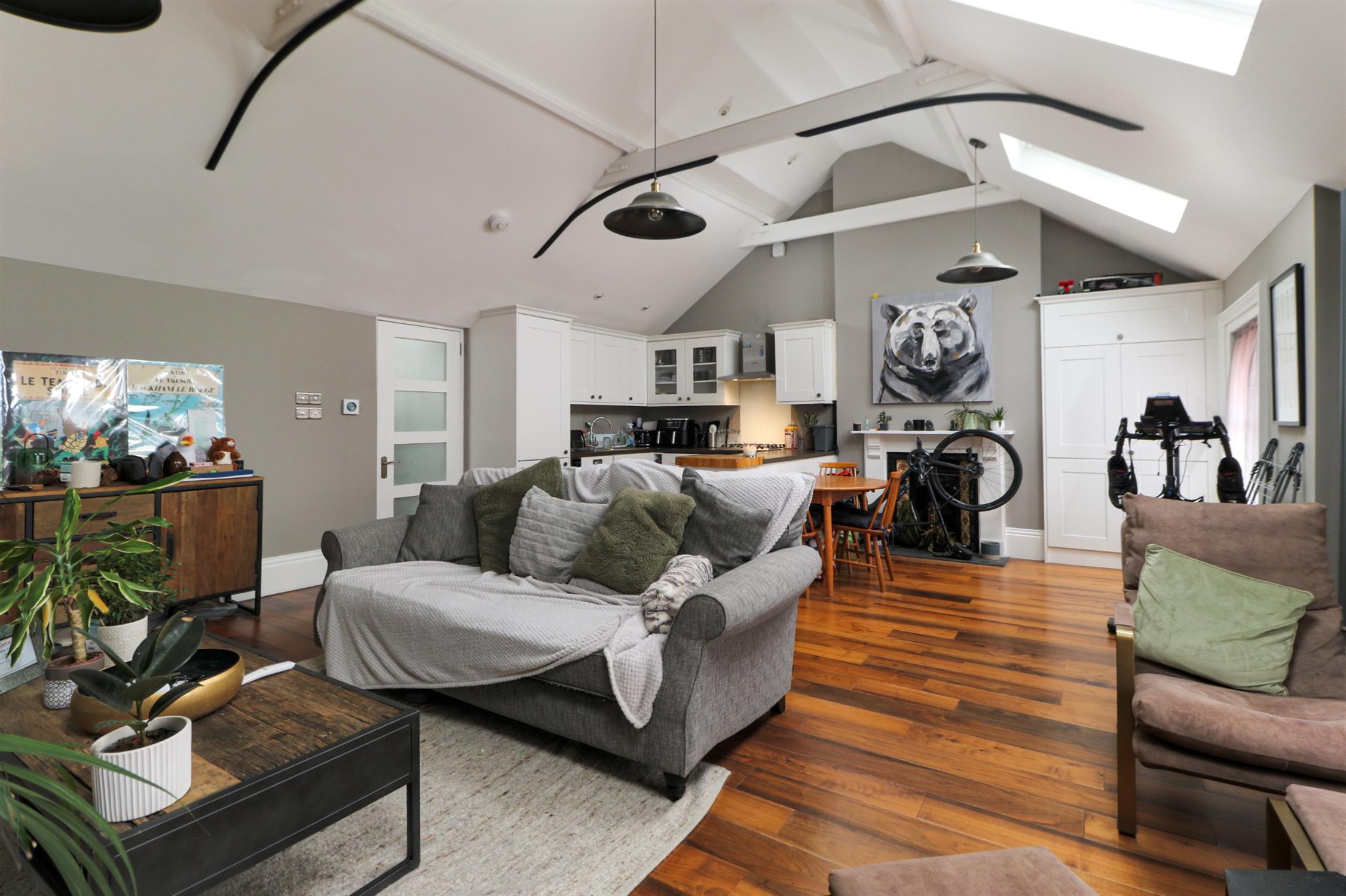 Smooth, vaulted ceiling, two hard wood sash windows, three Velux roof windows, recessed LED lighting, three pendant lights, two tall column radiators, two decorative feature fireplaces, recessed fitted cupboard and lacquered walnut engineered wood flooring.