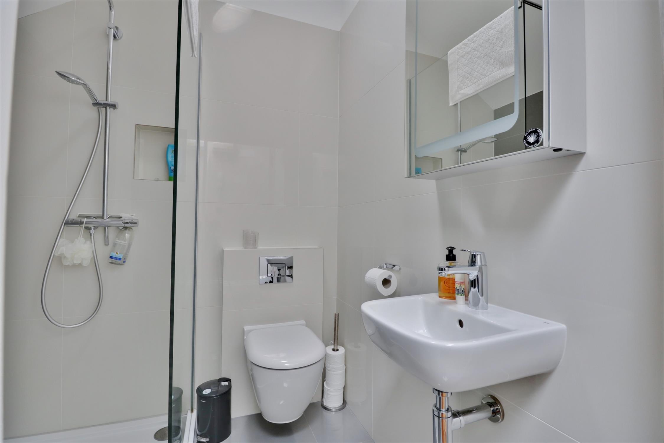 Smooth ceiling with inset spotlights, shower area with rainfall shower attachment and glass screen. Low level WC, wash hand basin, wall mounted mirror with LED strip lighting, extractor fan, ladder radiator, polished porcelain wall and floor tiles.