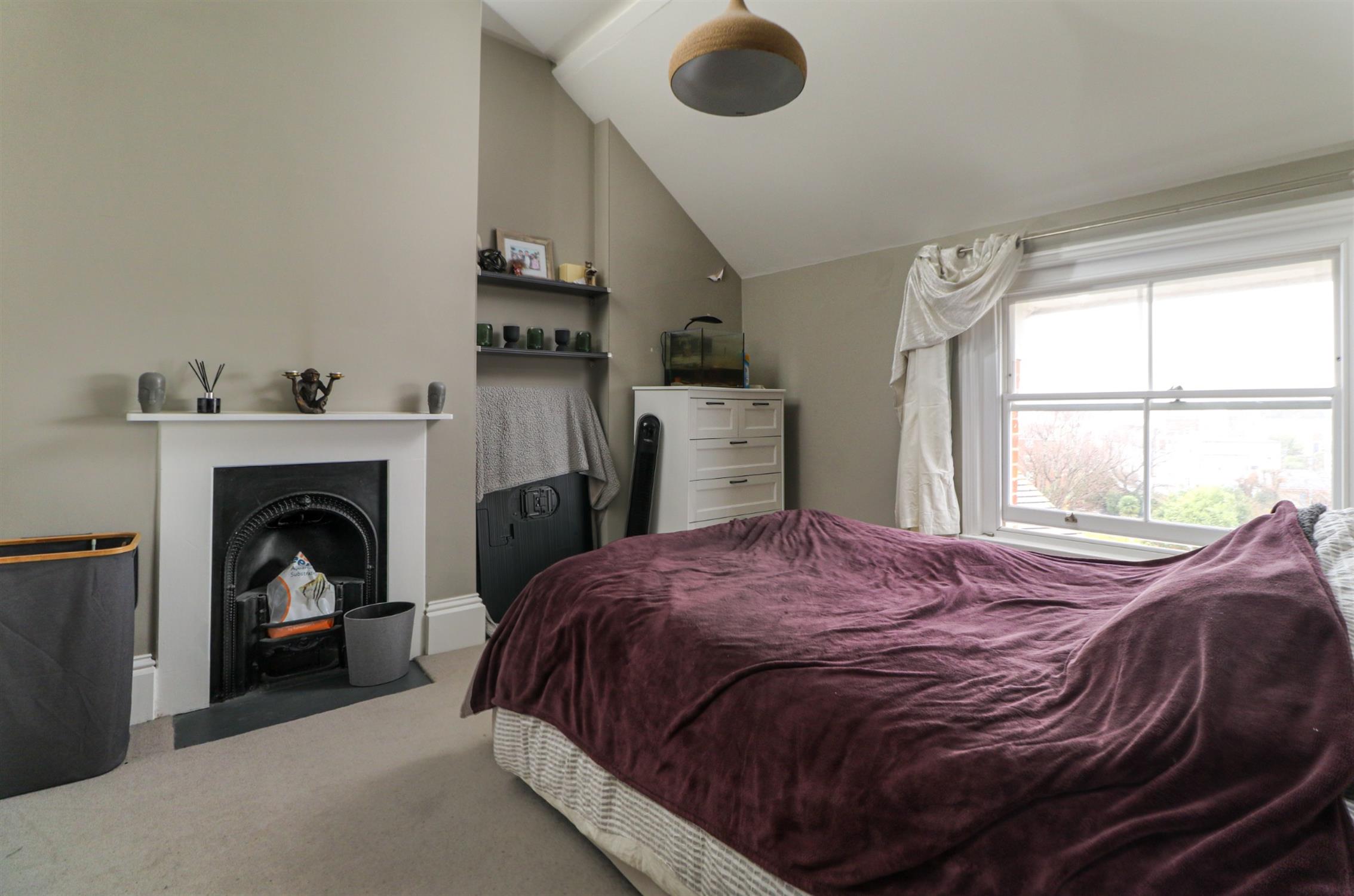 Smooth, part-vaulted ceiling, decorative feature fireplace, tall column radiator, sash window to rear and fitted carpet.