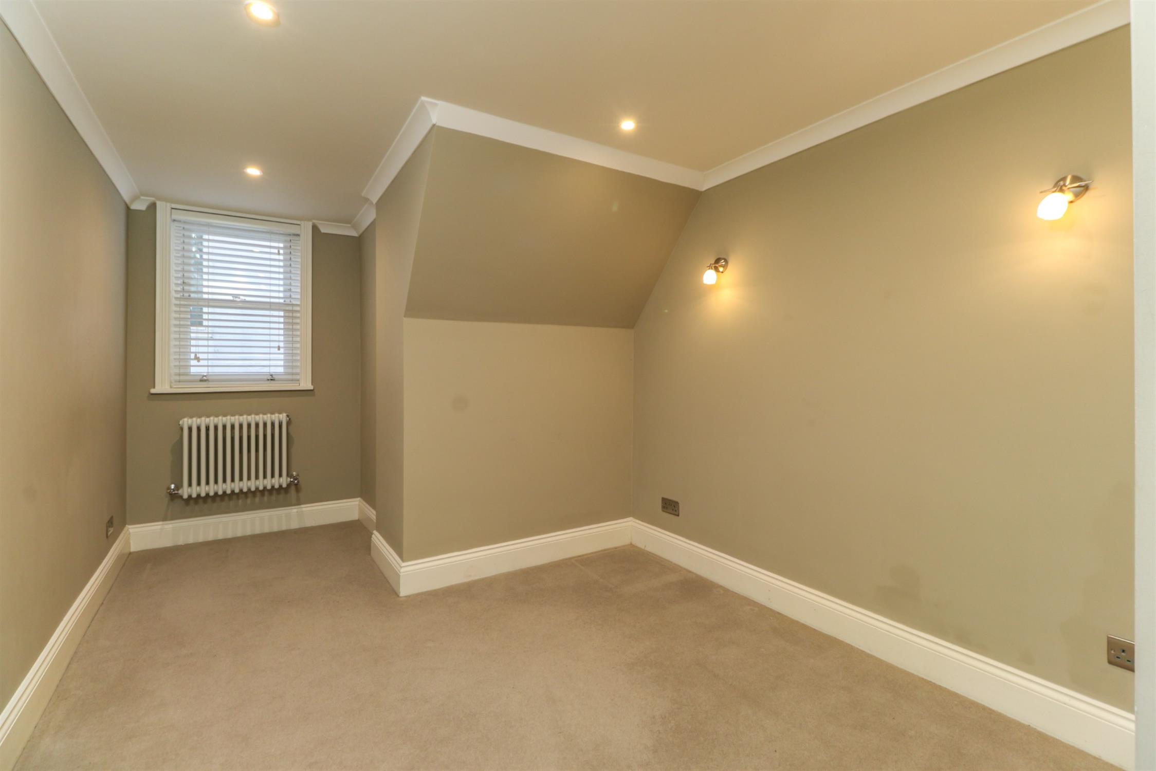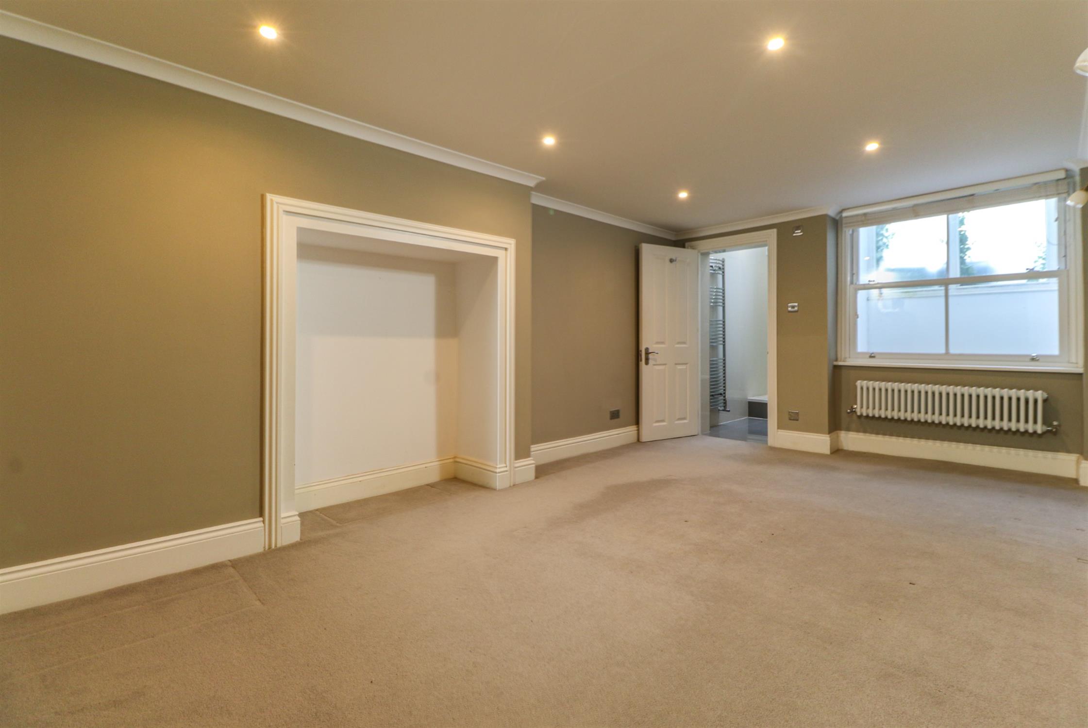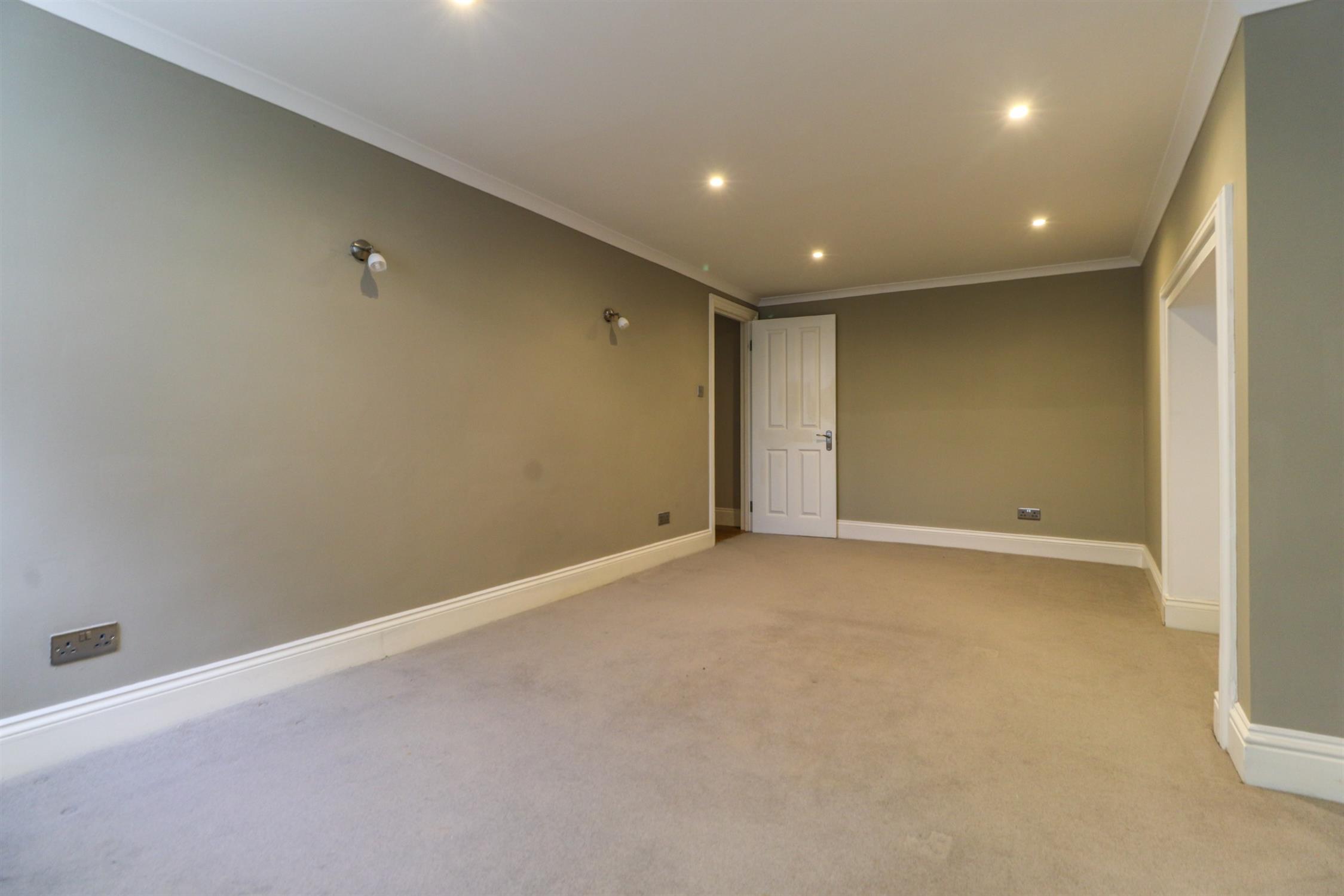 Smooth and coved ceiling, inset spotlights, wall lights, column radiator, sash window to rear, fitted carpet.