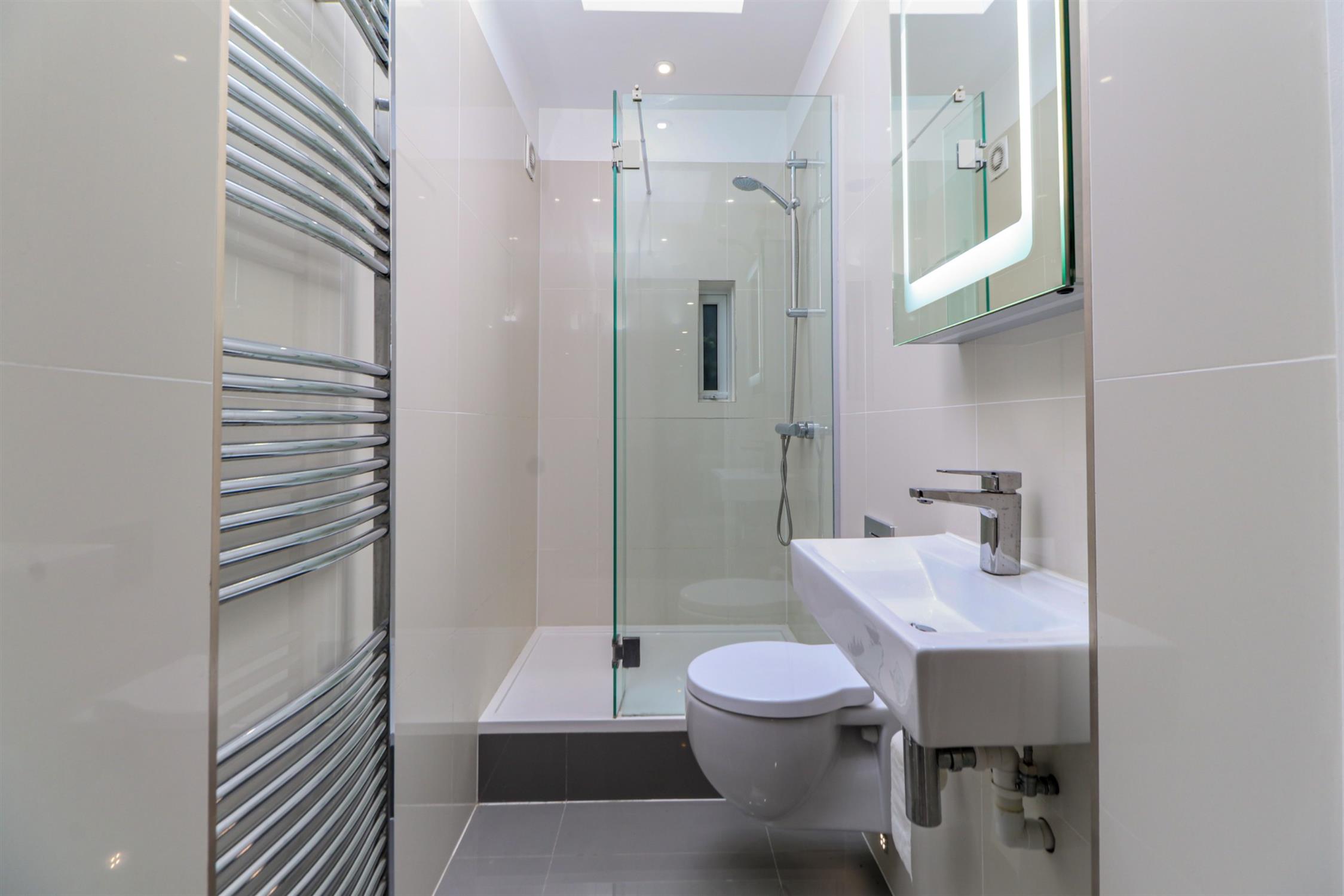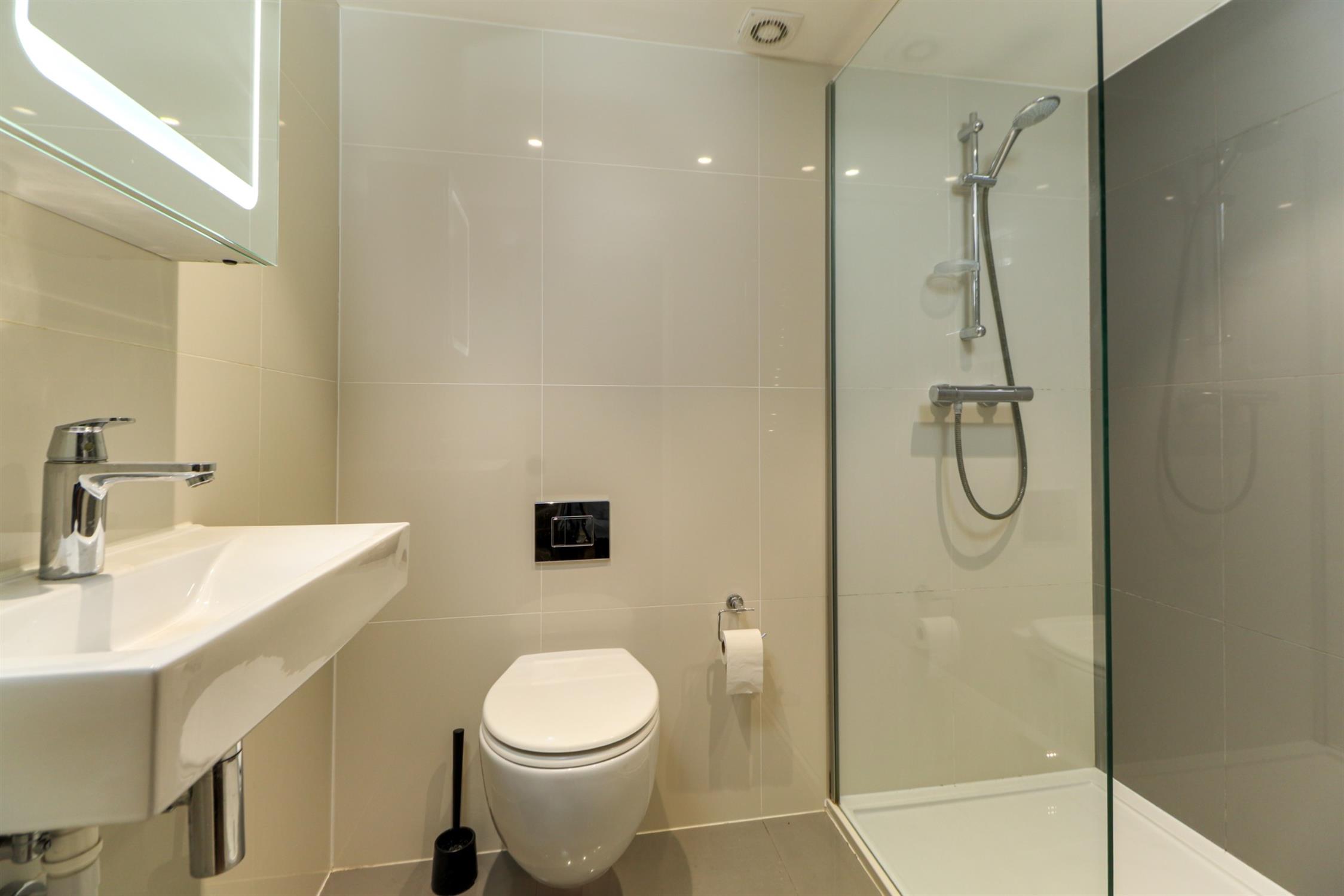 Smooth ceiling with inset spotlights, shower area with rainfall shower attachment and glass screen, low level WC, wash hand basin, wall mounted mirror with LED strip lighting, extractor fan, ladder radiator, polished porcelain wall and floor tiles.