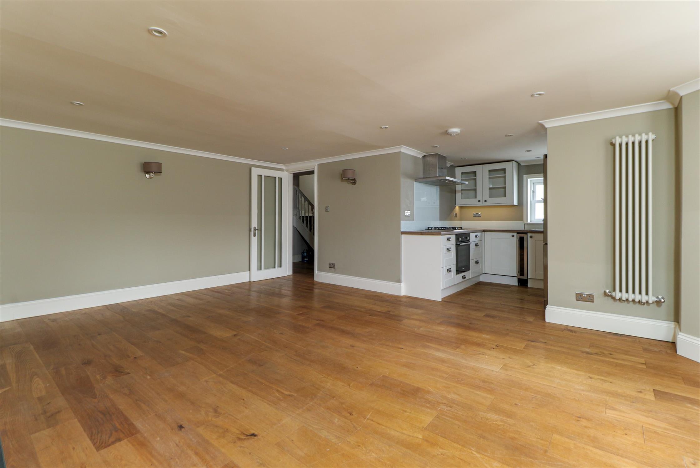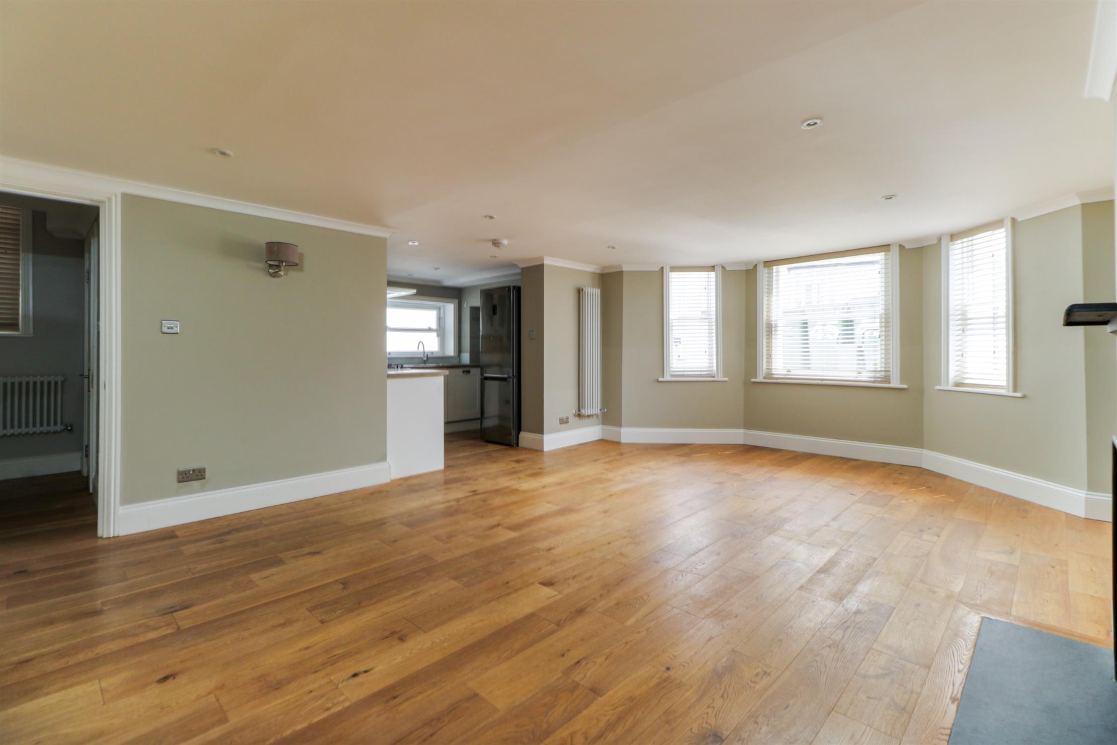 Smooth ceiling, hardwood sash windows in bay, two tall column radiators, decorative feature fireplace, lacquered walnut engineered wood flooring, open to: