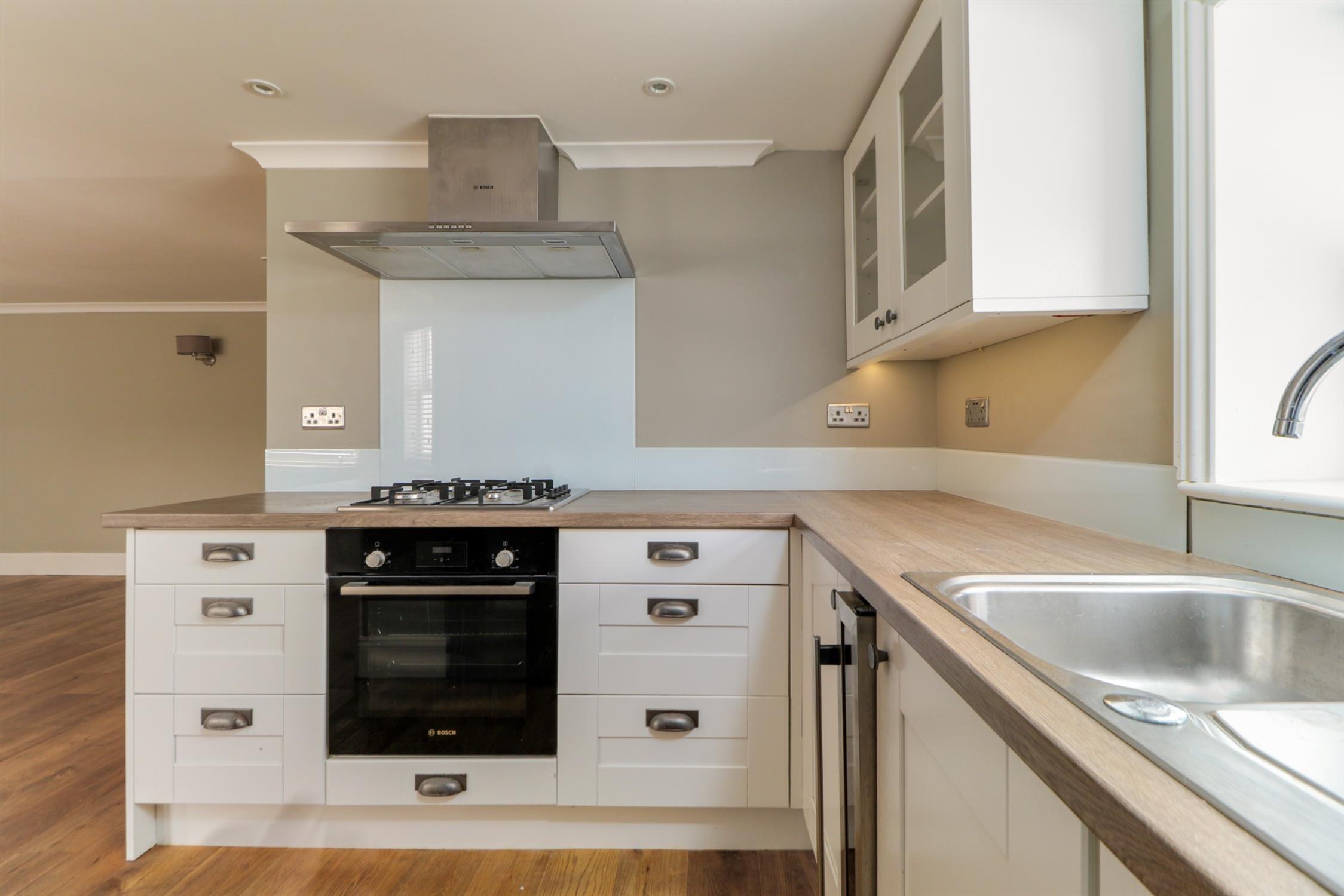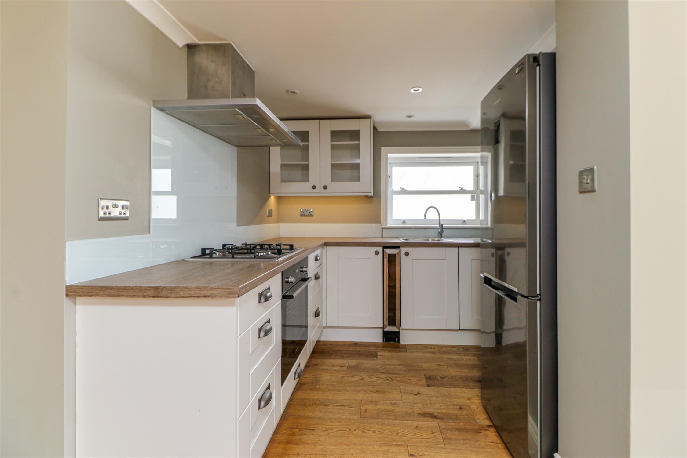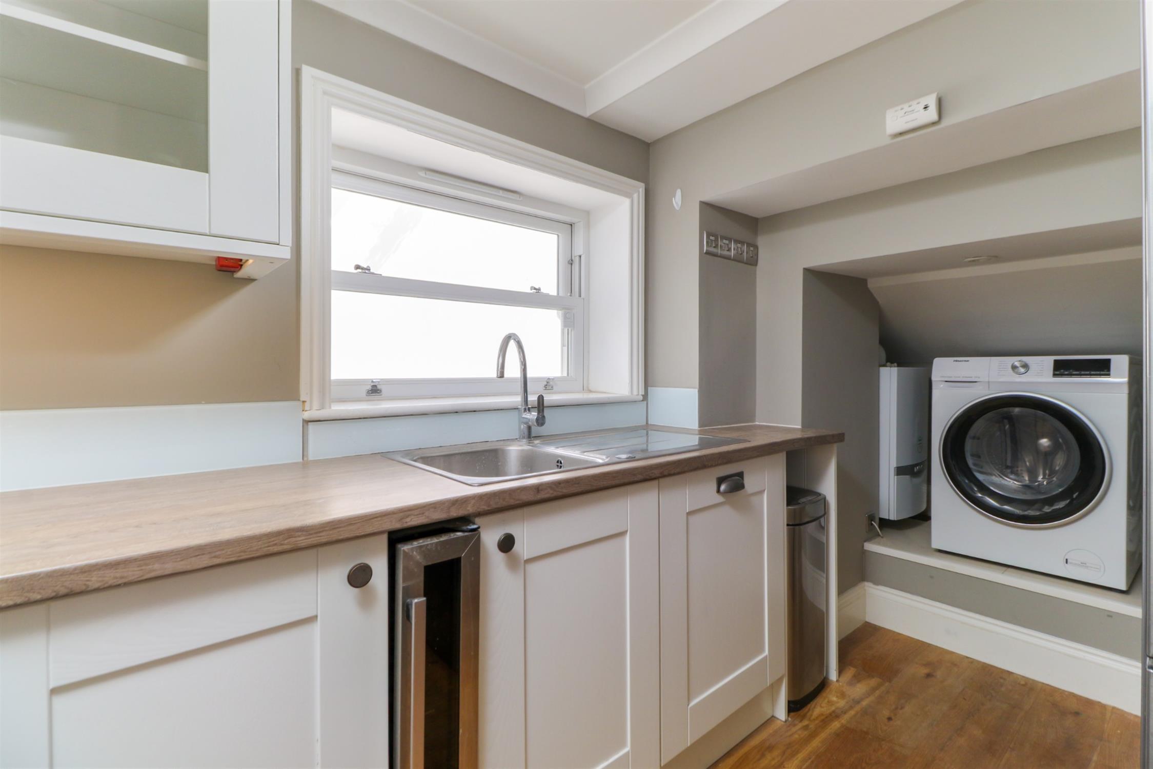 Smooth ceiling, inset spotlights, hardwood sash window, modern range of wall and base mounted units with work surfaces over with inset stainless steel sink and drainer with mixer tap over, integrated appliances including electric oven, gas hob with extractor fan over, wine cooler and dishwasher, freestanding fridge freezer and washing machine, recess housing wall mounted gas combination boiler.