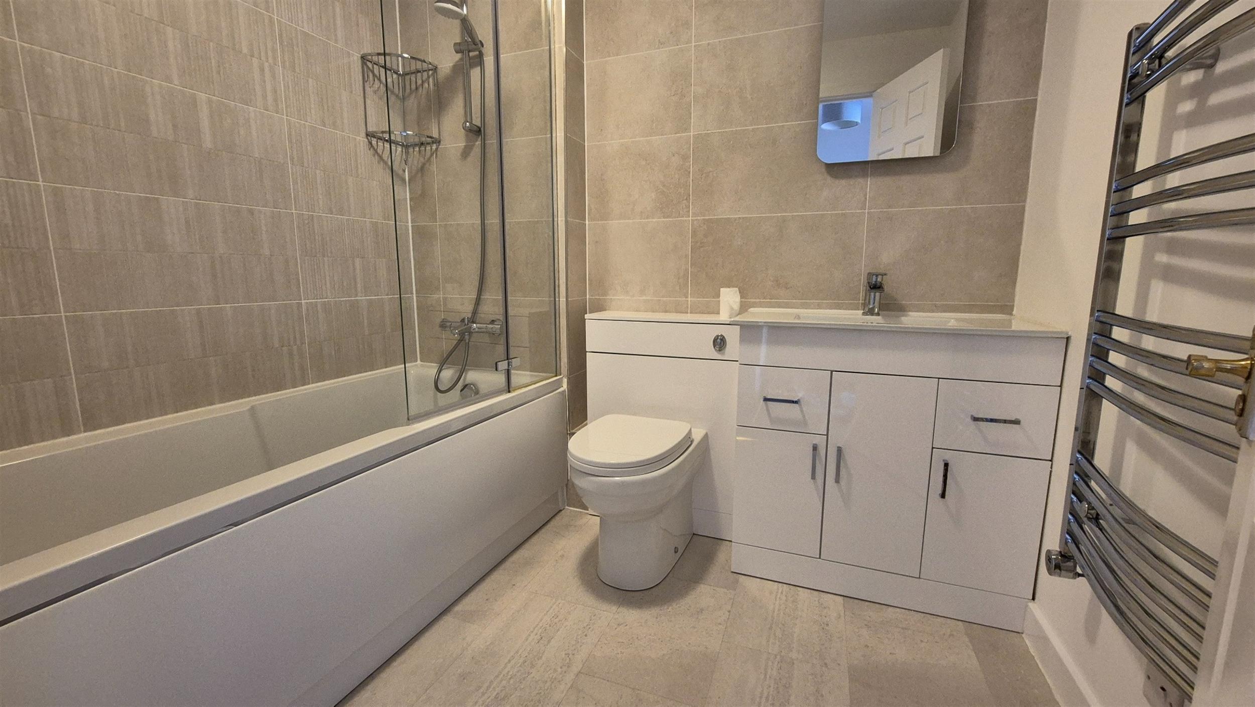 BATHROOM – White suite bathroom with shower over bath, vanity unit with sink and toilet inset.