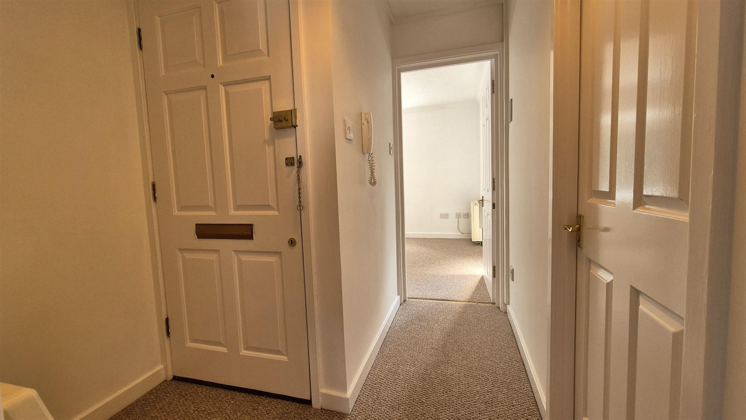 APARTMENT ENTRANCE HALL – Carpeted flooring with doors to bedroom, bathroom and lounge.