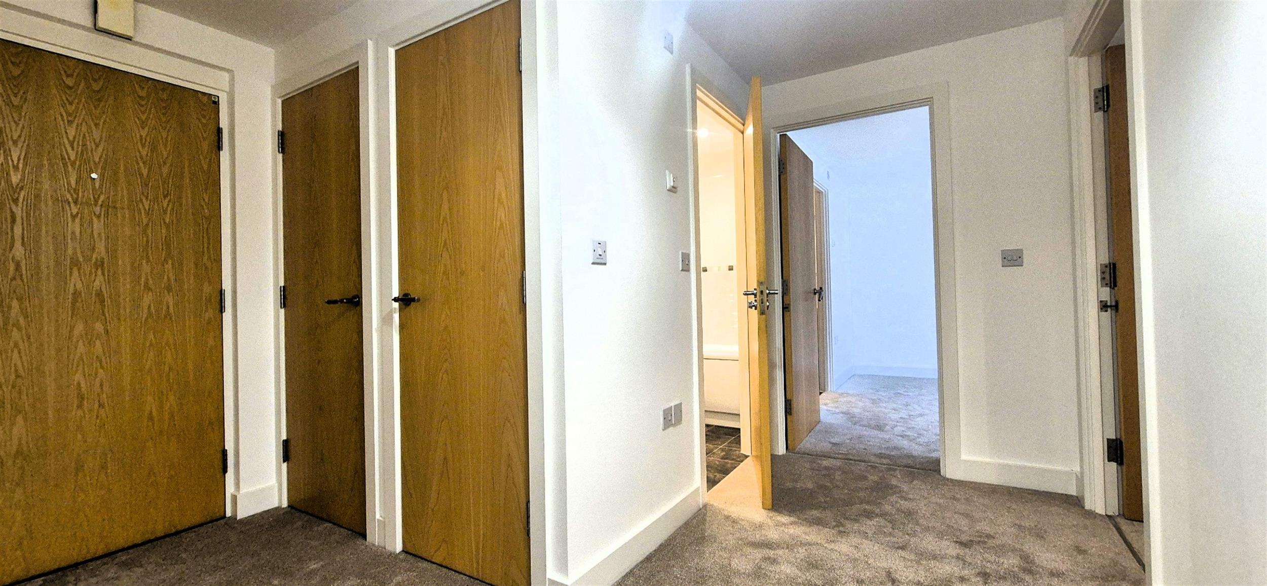 APARTMENT HALLWAYCarpeted flooring with doors to majority of rooms and 2 handy cupboards.