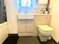 BATHROOM – White suite family bathroom with shower over the bath, sink and toilet set in vanity unit. Window to rear.