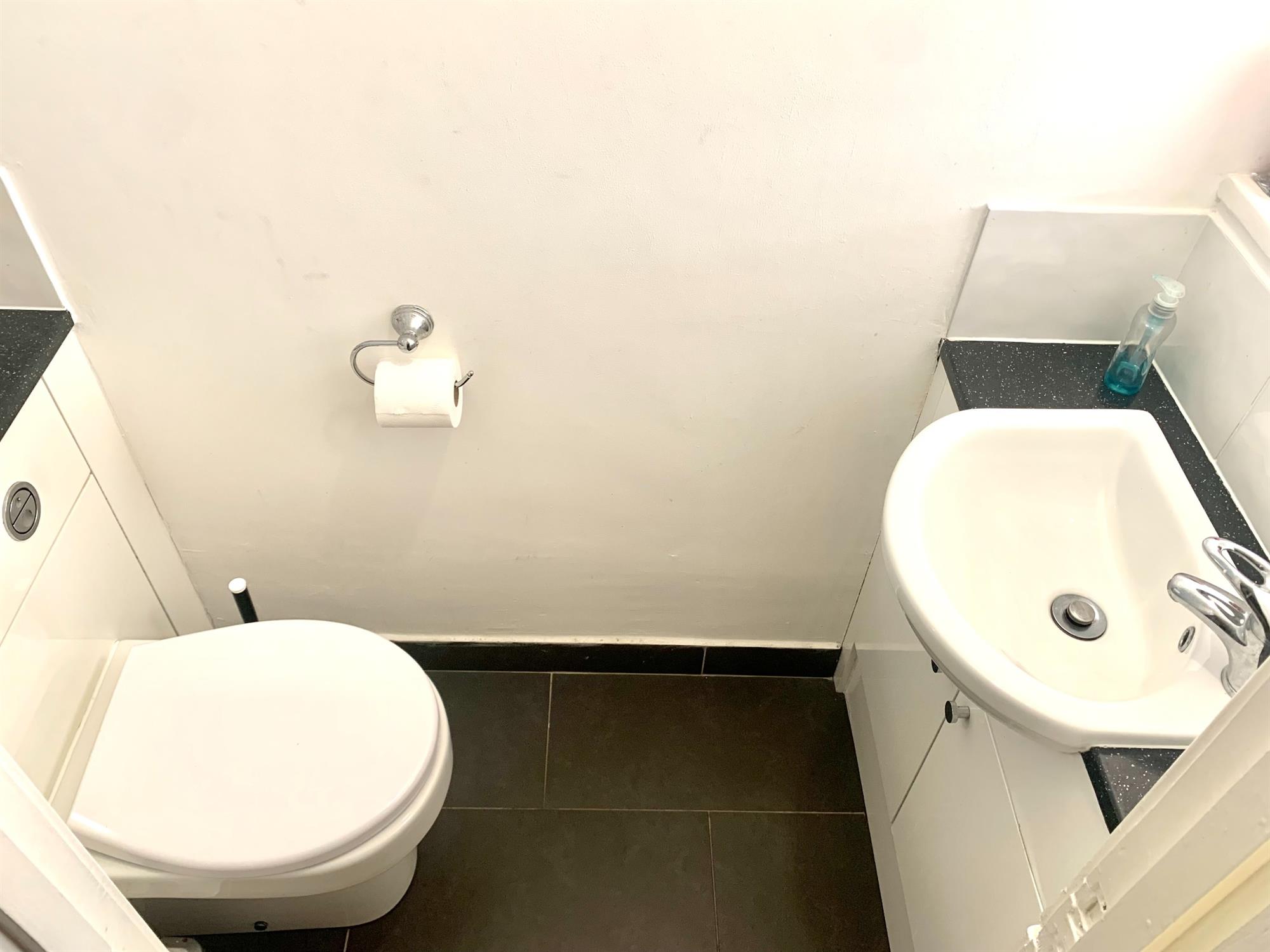 CLOAKROOM – Tiled flooring with window to front, toilet and basin set in vanity cupboard.