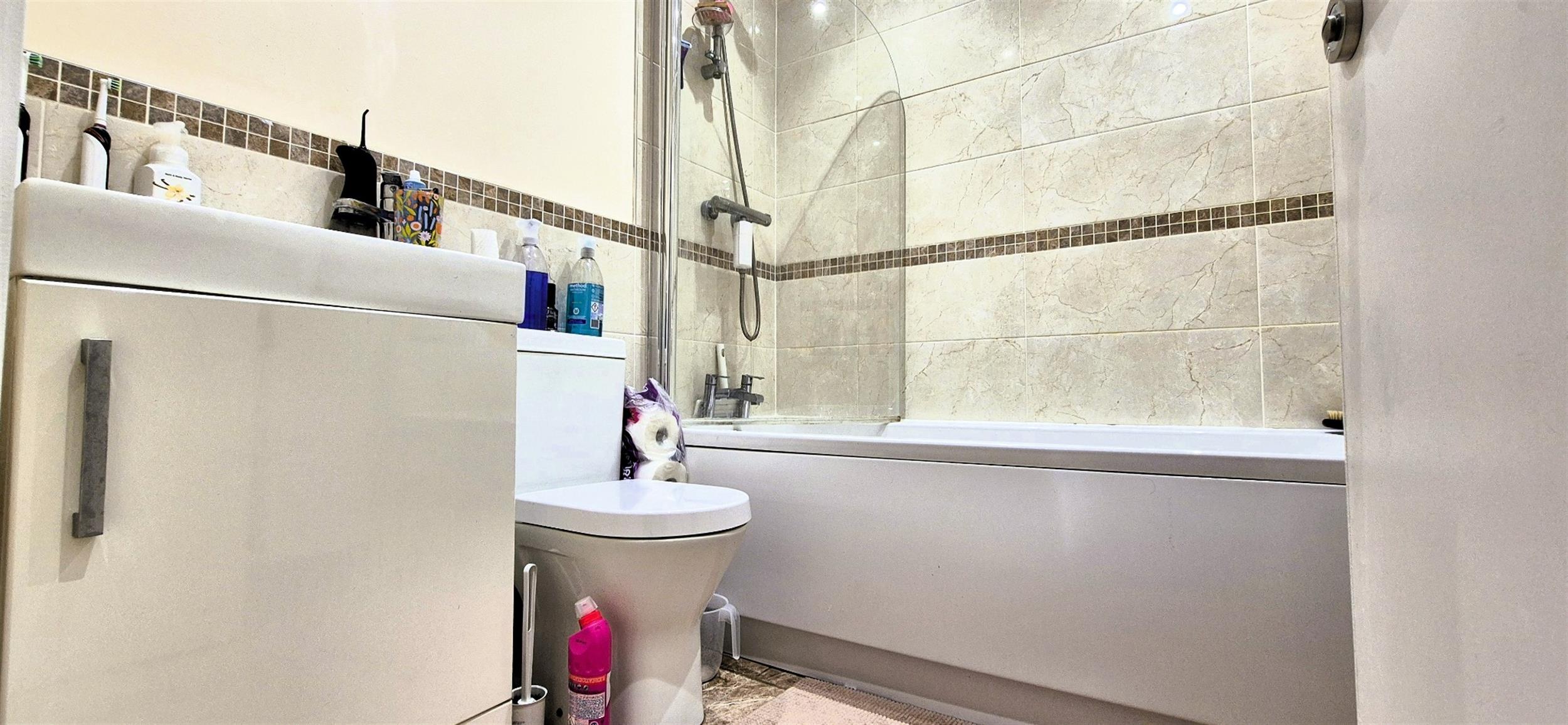 BATHROOM - White suite which includes toilet, basin and shower over bath.