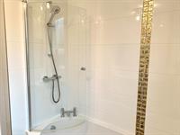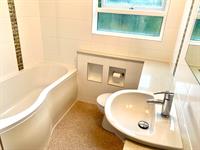 White suite bathroom with sink and toilet inset in vanity unit and bath with shower over. Handy storage cupboard off.