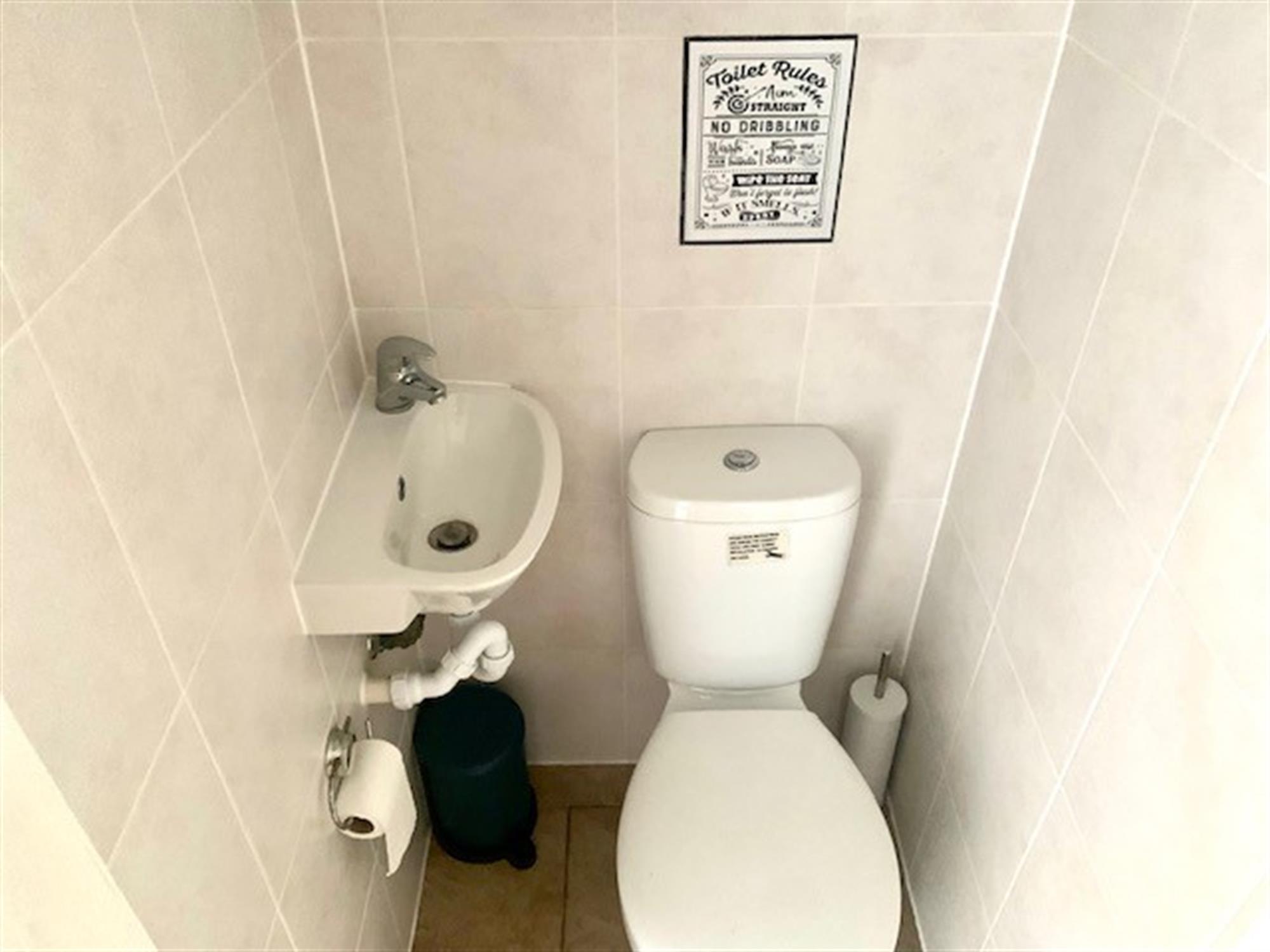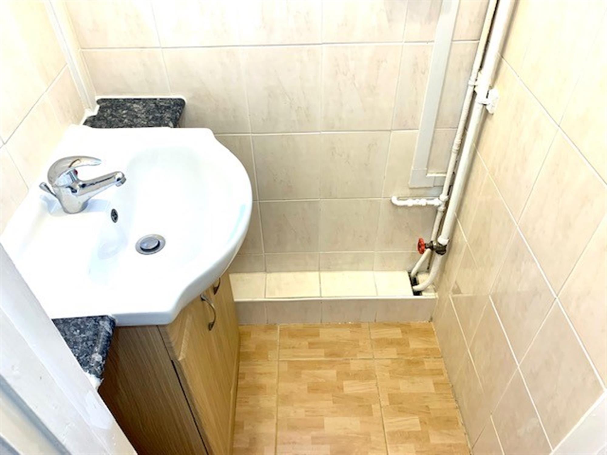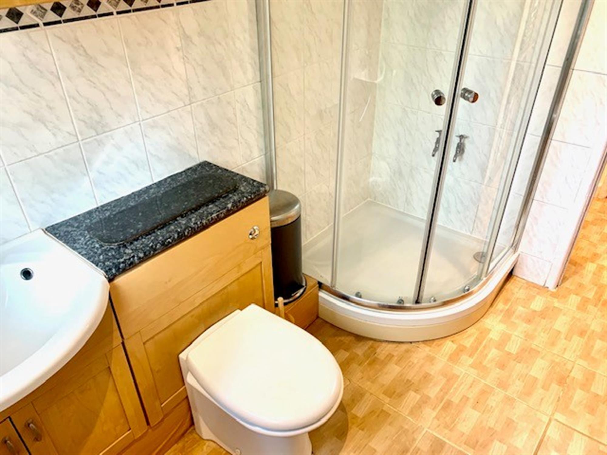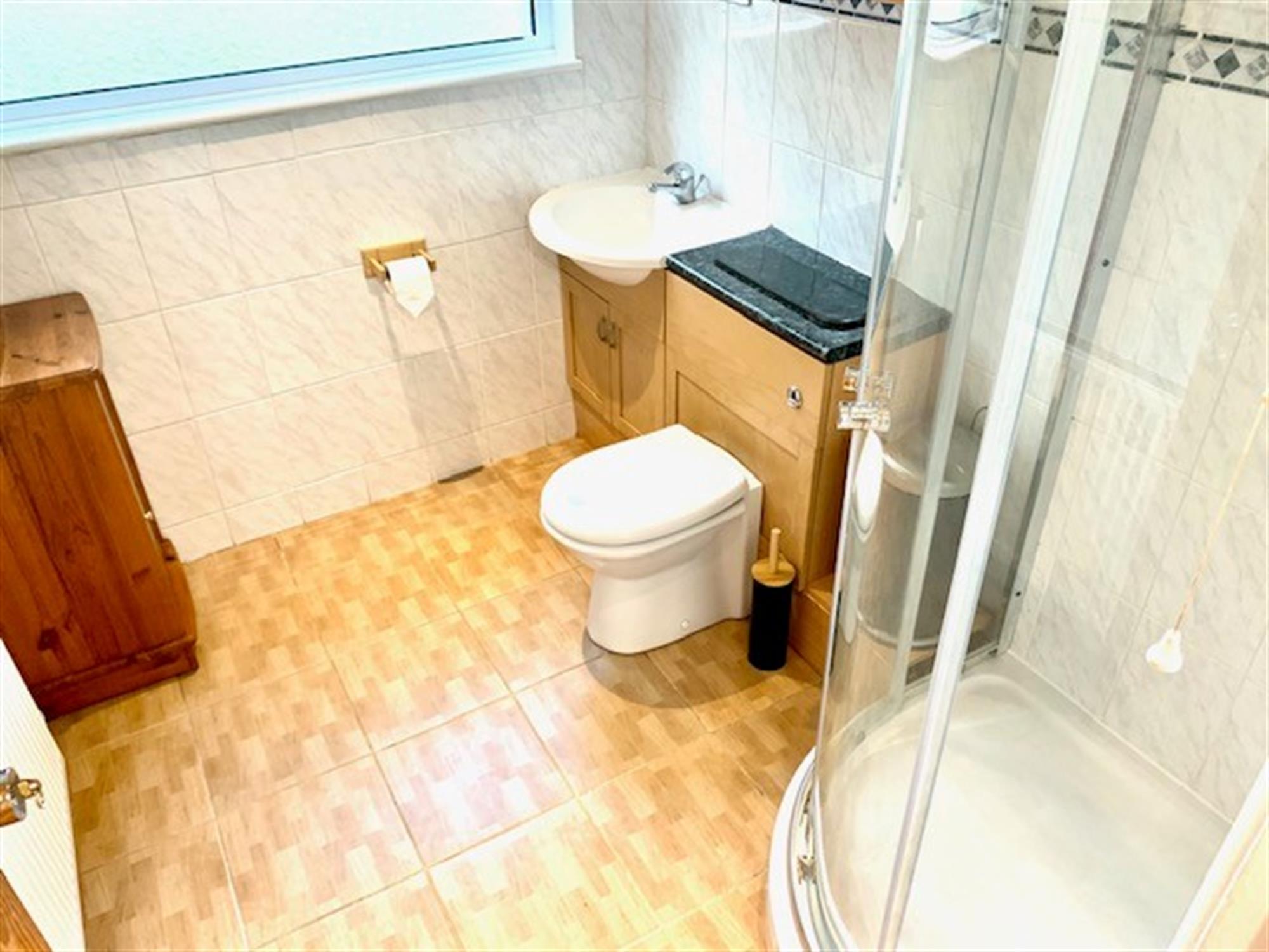 Passage way with sink leading into the shower room which has window to rear, sink and toilet set in vanity unit and corner shower cubicle.