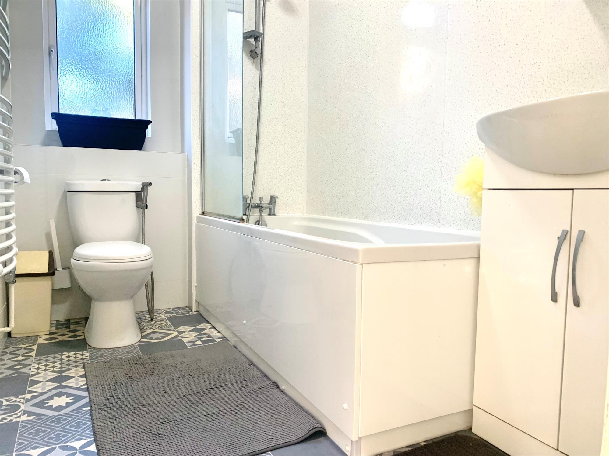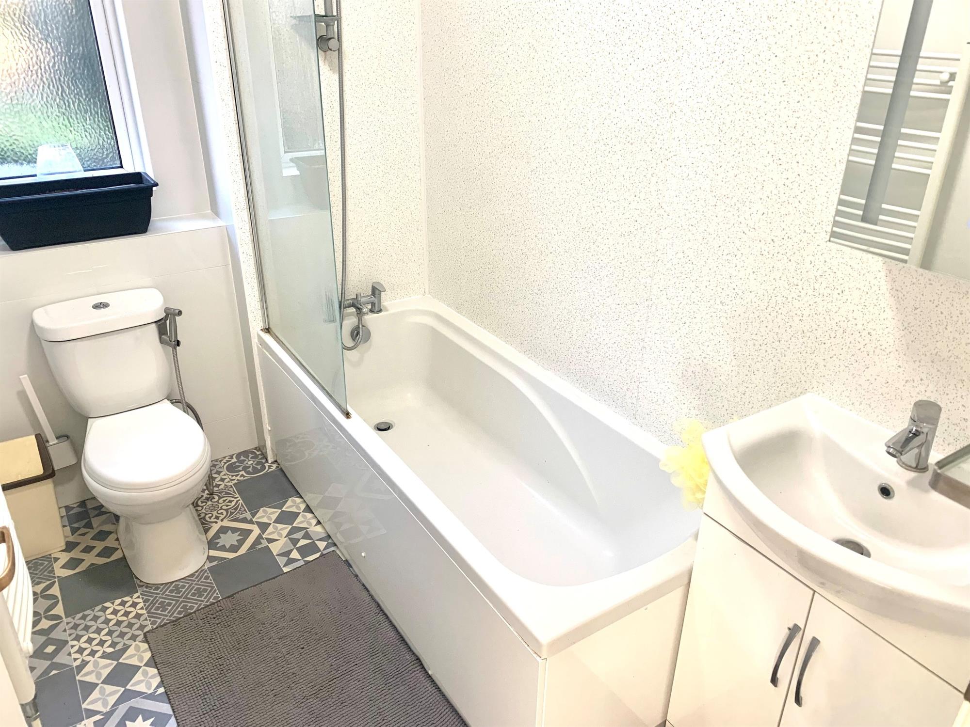 BATHROOM - White suite with bath with shower over, sink and toilet. Window to rear.