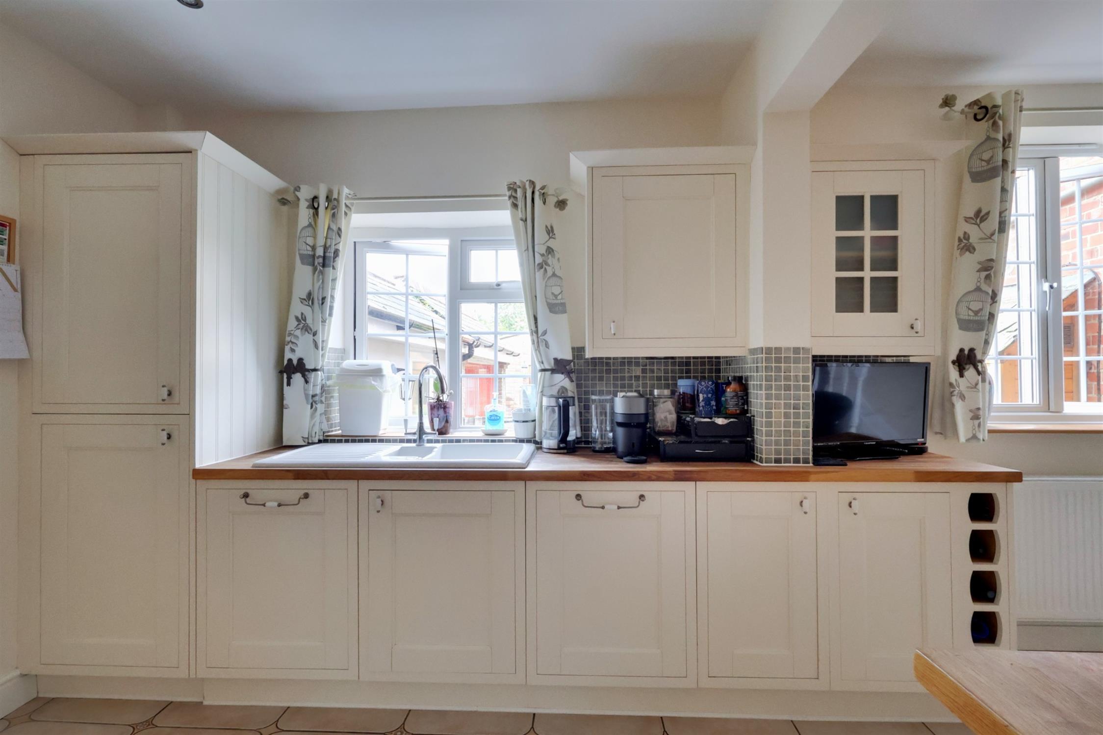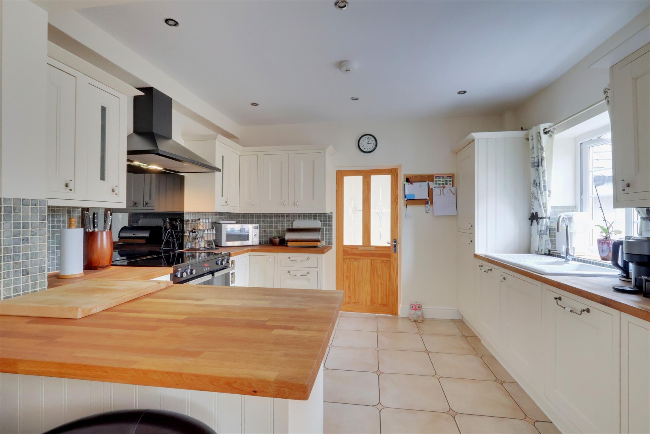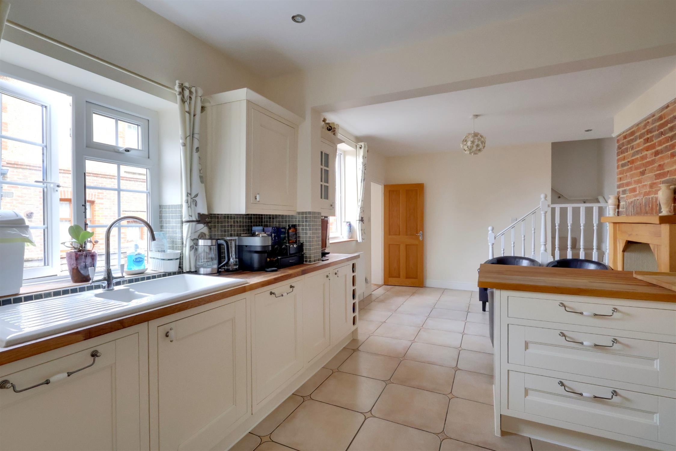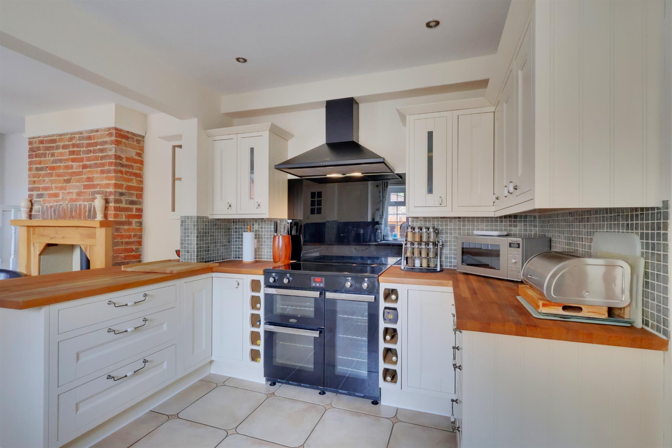 Smooth plastered ceiling with inset lighting. Feature brick fireplace with wood burner set in wooden surround. UPVC windows to side aspect. Tiled flooring. A range of modern fitted light coloured drawer and cupboard units set beneath solid, wooden worktops with inset sink/drainer. Space and electric point for electric cooker with splashback and fitted extractor hood. Integrated appliances include dishwasher and fridge freezer. Radiator. Three steps down into: