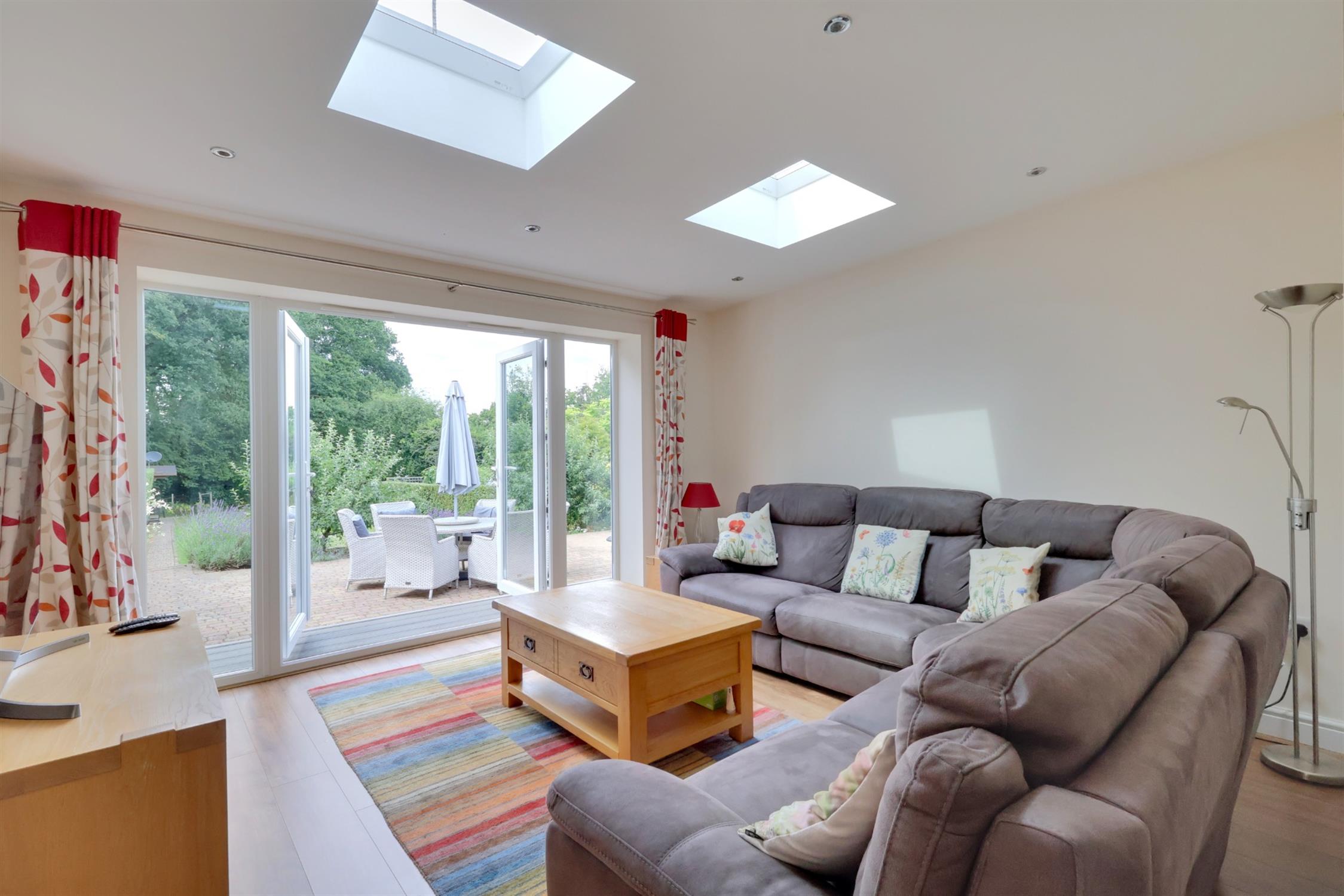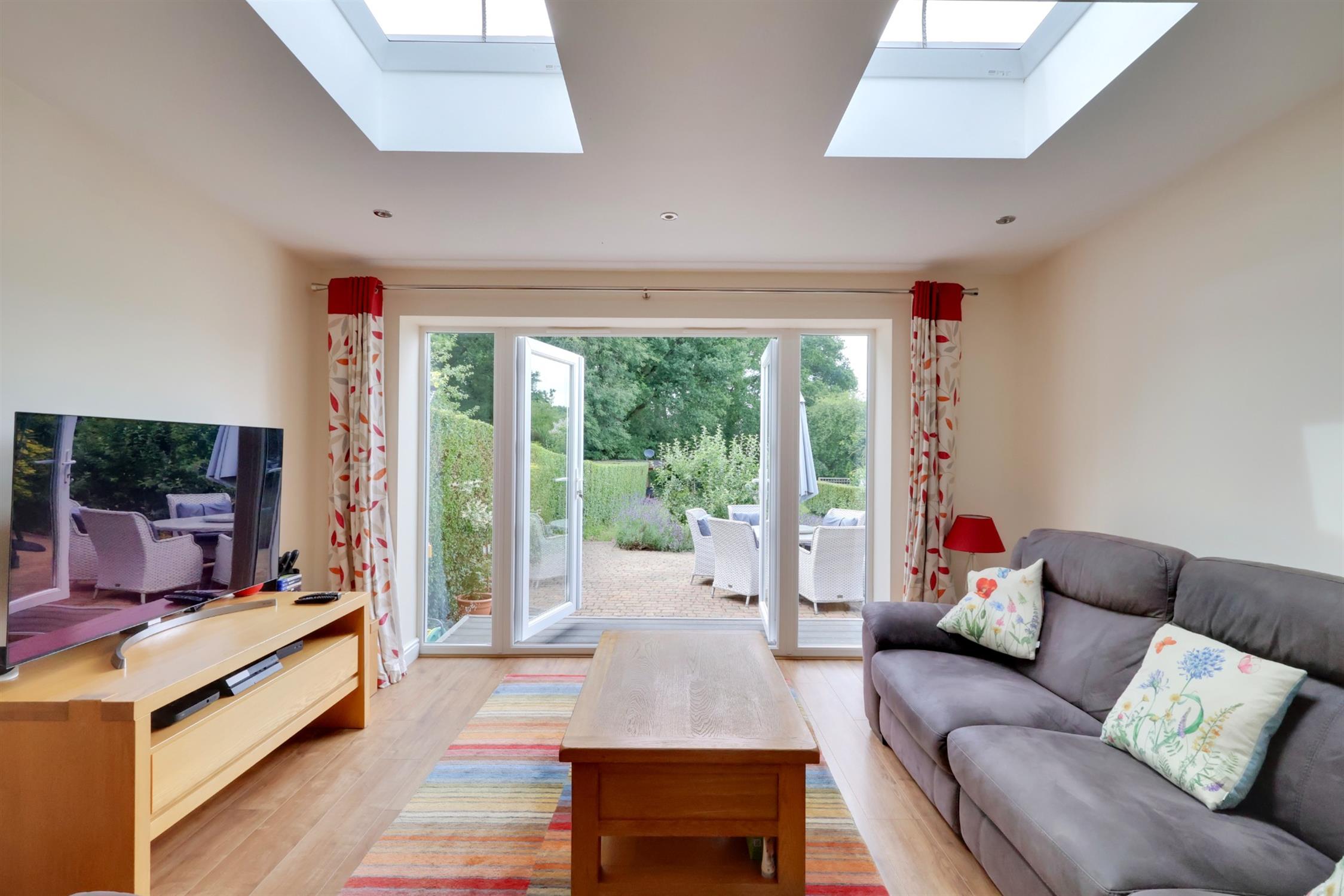 Rear extension with smooth plastered ceiling with two uPVC roof lights and integrated inset lighting. Large uPVC, French style doors leading to rear decked/paved patio area. Automatic rain sensored roof lights. Radiator and wooden laminate flooring. Door to :