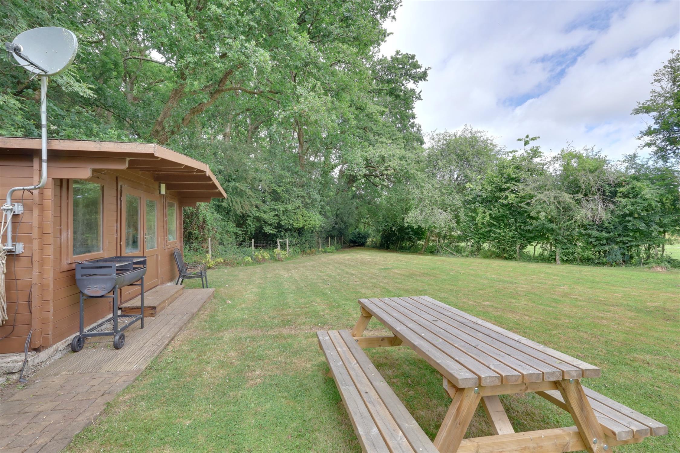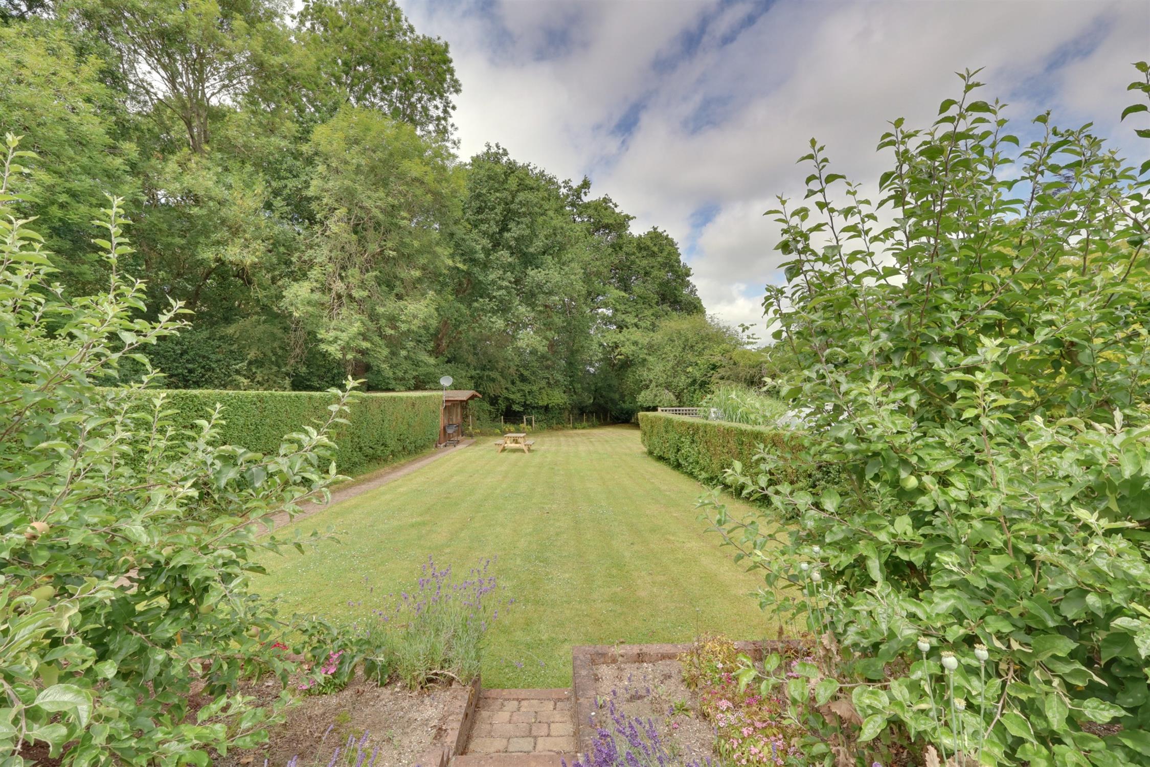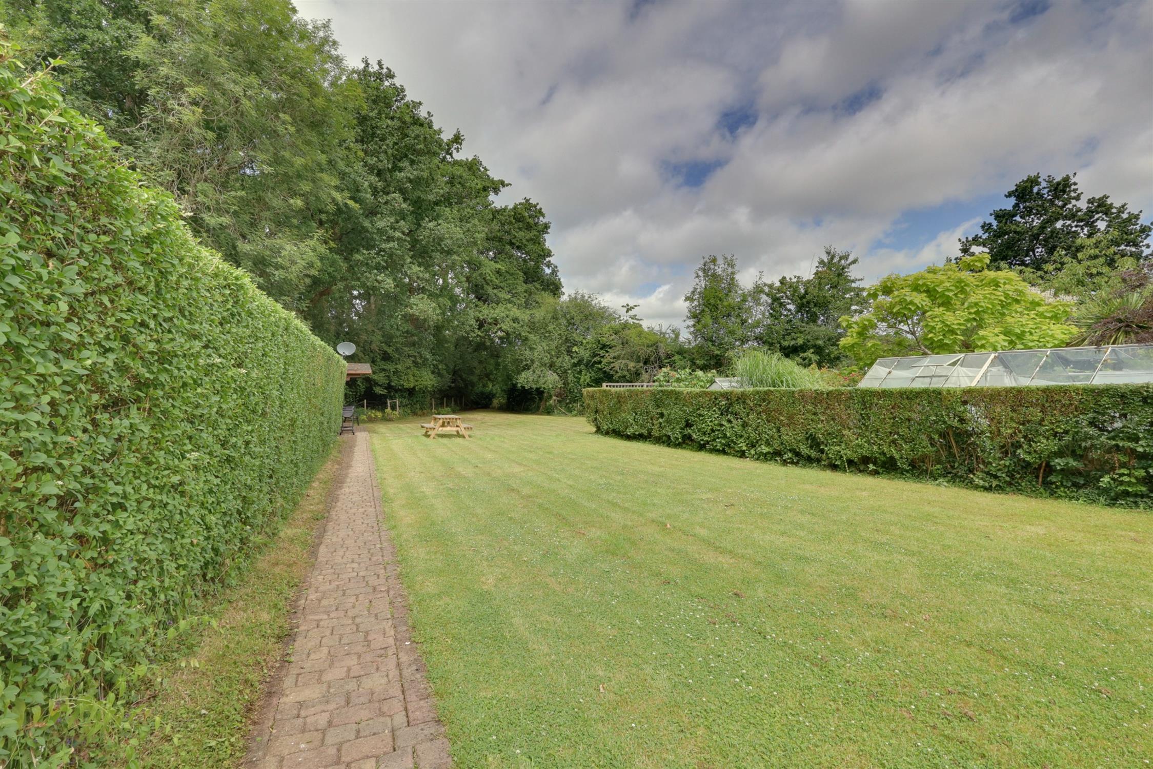 Backing on to wooded area, the spacious garden is mainly laid to lawn with paved pathway down the side. Paved patio area with summer house, greenhouse and storage shed.