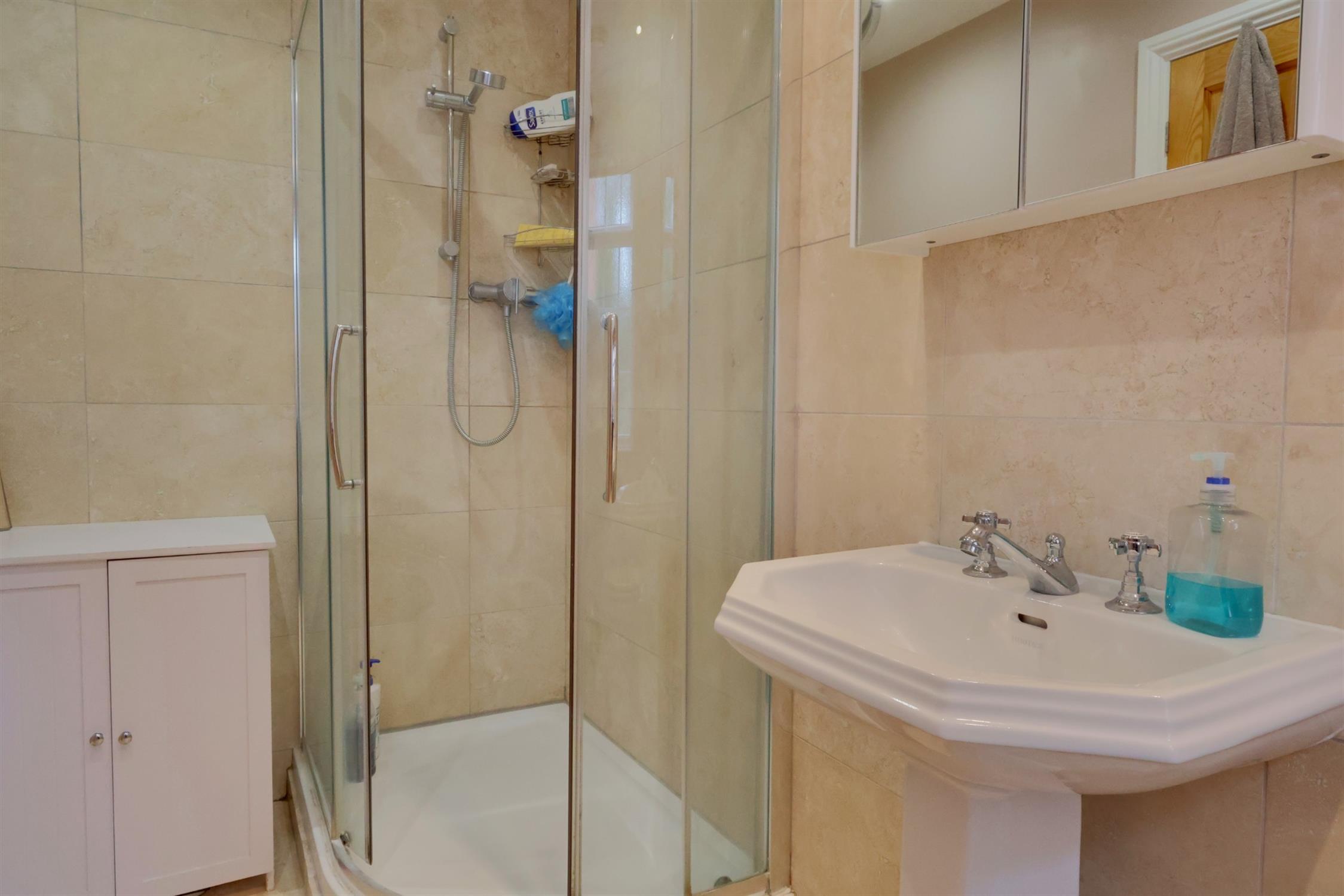 UPVC obscured window to side aspect. Inset ceiling lighting. Panelled bath, central mixer tap with telephone style shower attachment. Pedestal wash basin. Ladder style heated towel rail.
