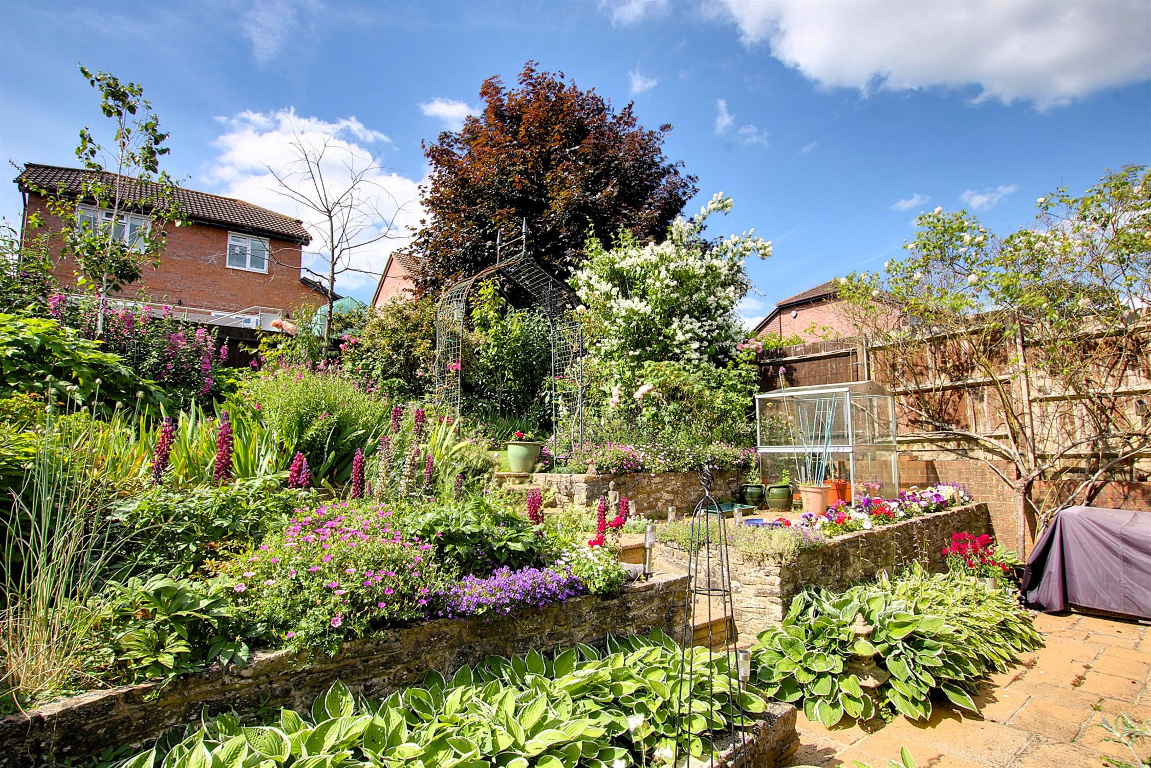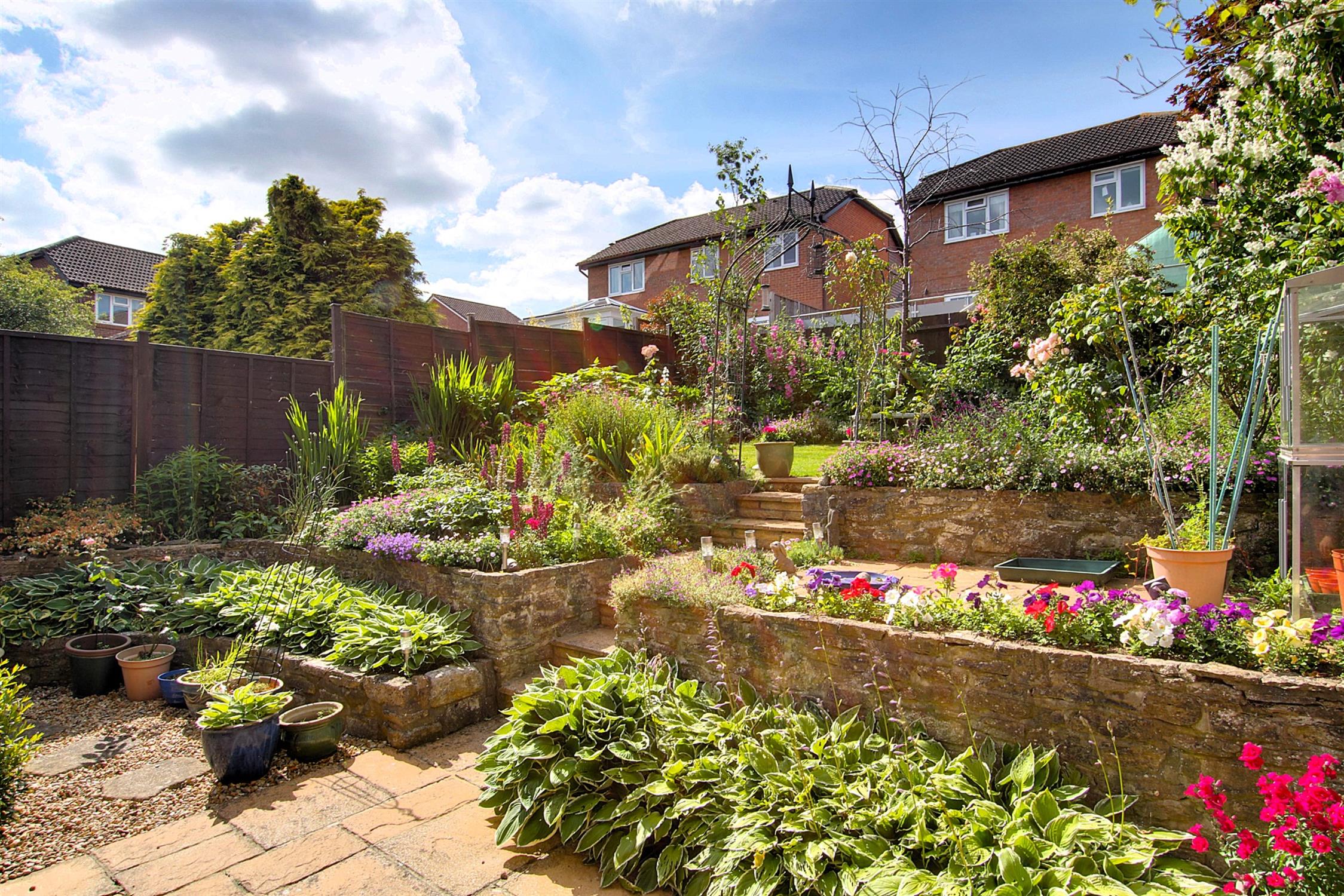 To the front, there is a neat landscaped garden laid to lawn with well-stocked flower and shrub borders, and a block paved drive with room for two cars leading to the attached garage which has an electric roller door, power and light, and internal door to the kitchen. There is side access to the rear garden which has been attractively landscaped with stone-fronted terracing planted with a stunning array of flowers, plants and shrubs, with steps leading to a raised area laid to lawn with additional flower borders.