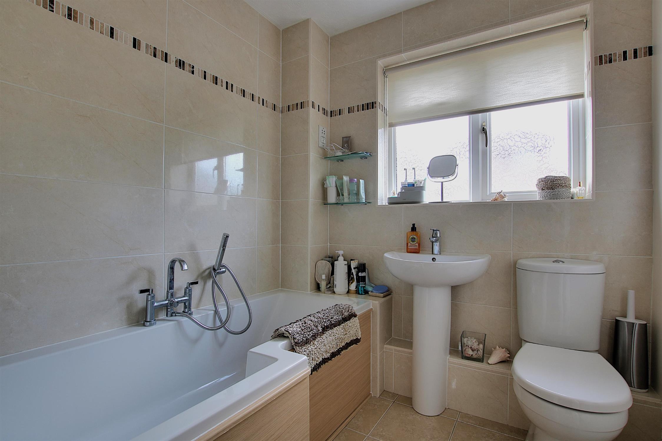 On the first-floor landing is access to the loft space, the airing cupboard housing the hot water cylinder, and a window to the side providing natural light. Also on the first floor are three bedrooms, two doubles and a good size single with a range of built-in wardrobes to the main bedroom, and a stylishly fitted bathroom with an attractive suite comprising panelled bath with shower enclosure, pedestal wash basin, close-coupled WC, tiled walls and flooring, and double-glazed window to the rear.