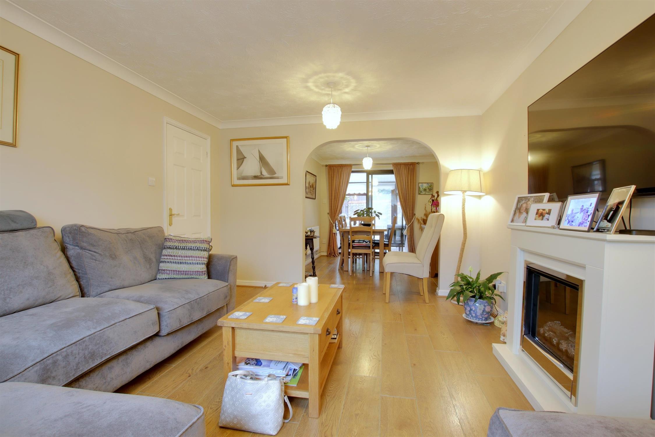 Dual aspect room with double glazed box bay window to front. Double glazed patio doors to conservatory. Modern electric fireplace. Two radiators. Engineered oak flooring.