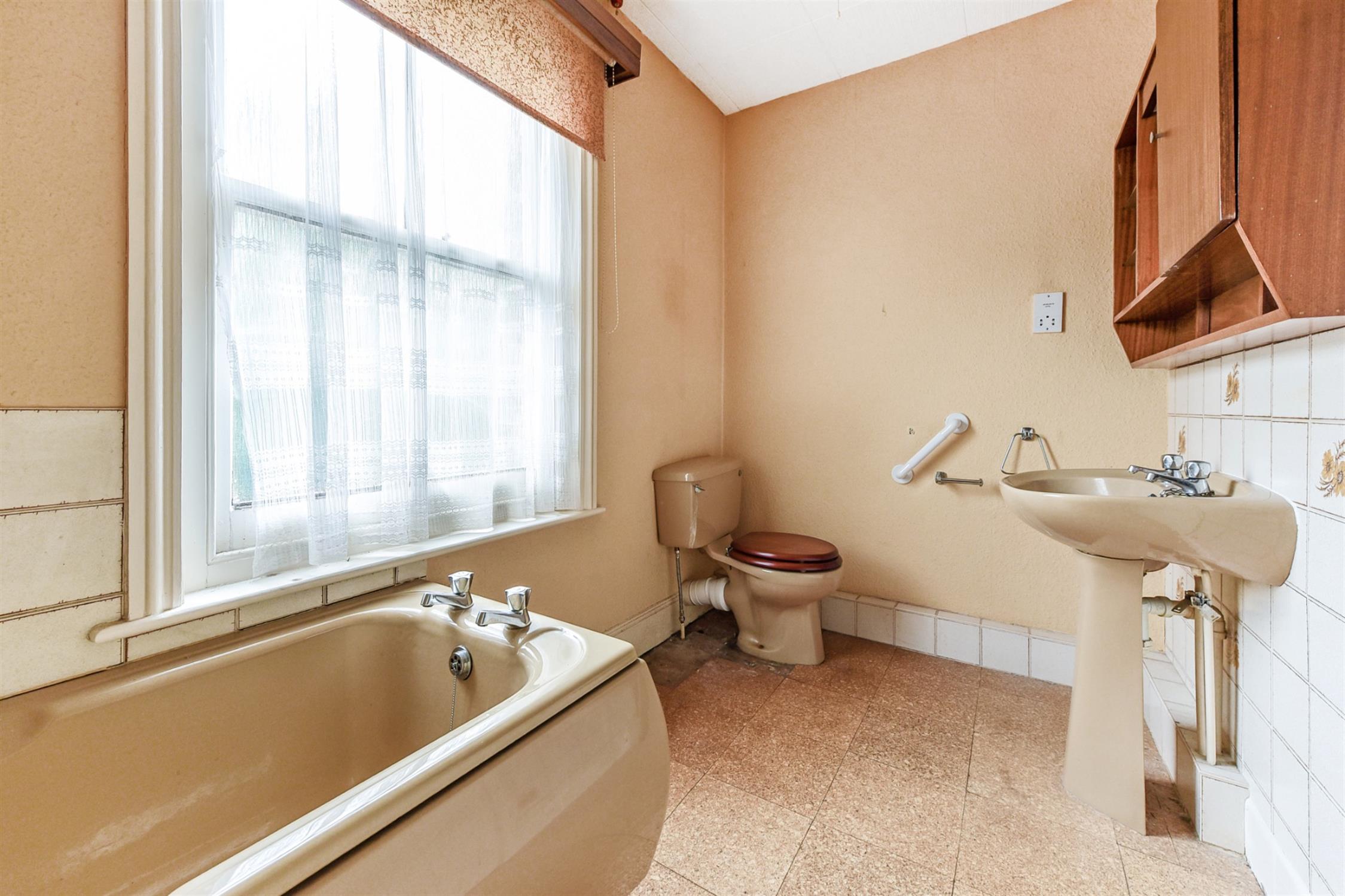 The bathroom is fitted with a bath and separate shower, a toilet, and a wall-mounted vanity unit. Garage