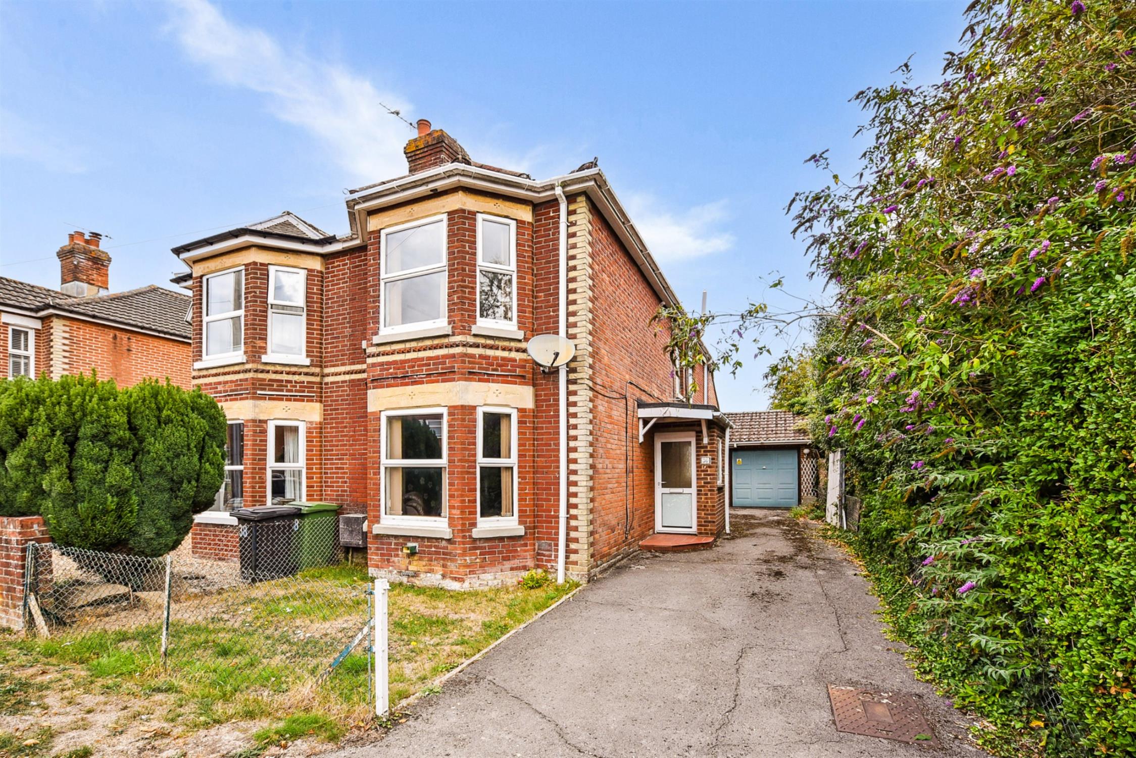 To the front is a small front garden, a private driveway runs alongside the house, offering off-road parking and direct access to a detached garage at the rear.