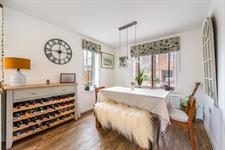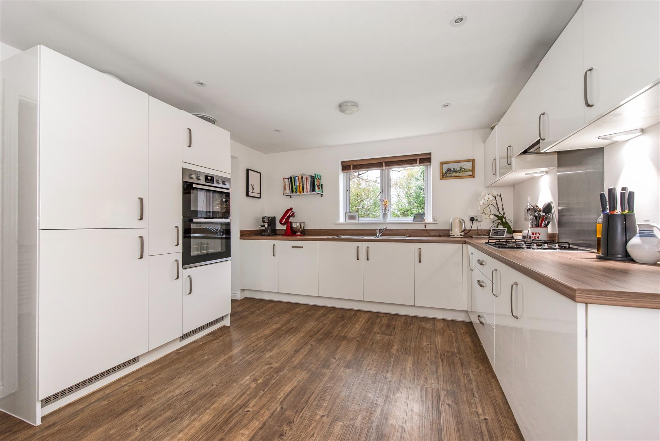 Triple-aspect kitchen, with windows on three sides letting lots of light into the space. Contemporary high and low level units, with integrated appliances including fridge-freezer, dishwasher, double oven, gas hob and stainless steel sink.