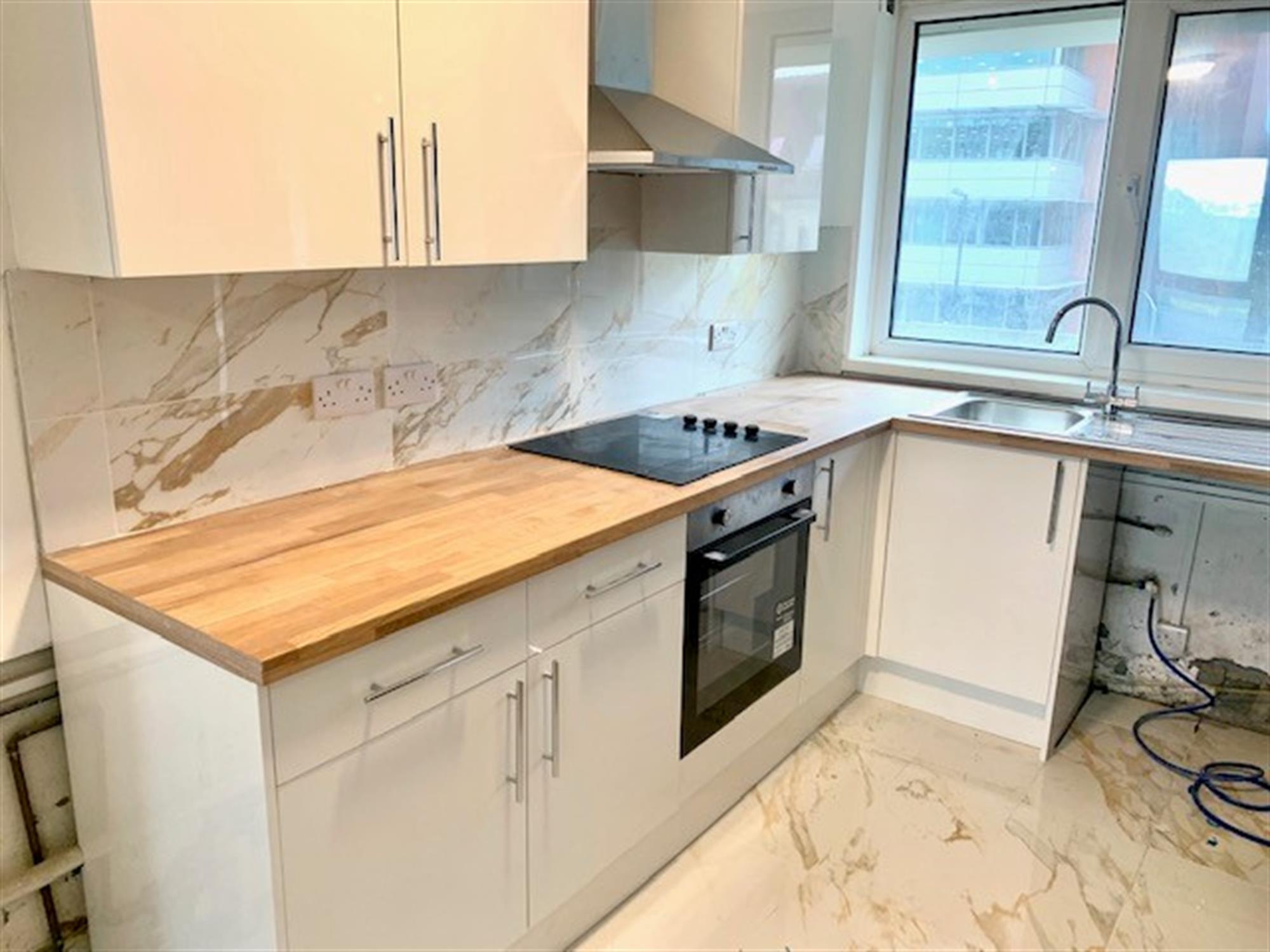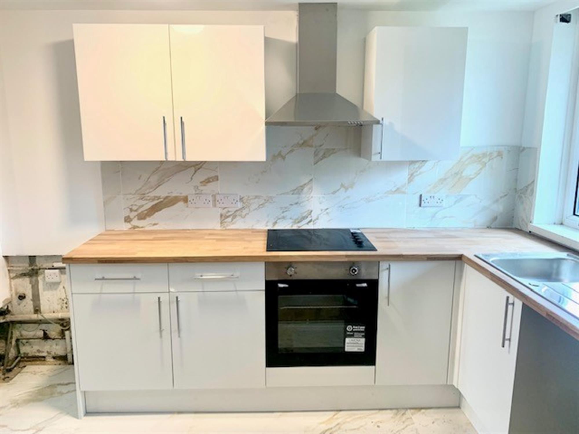 Brand new kitchen with various wall and base units. Appliances consisting of fridge/freezer, electric hob, electric oven and washing machine. Window to front.