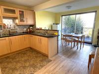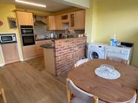 Window to side. Range of wall and base units with work surfaces over. One and a half bowl stainless steel sink unit. Tiled splashbacks. 4 ring electric hob with extractor over. Built in eye level double electric oven. Space for microwave.