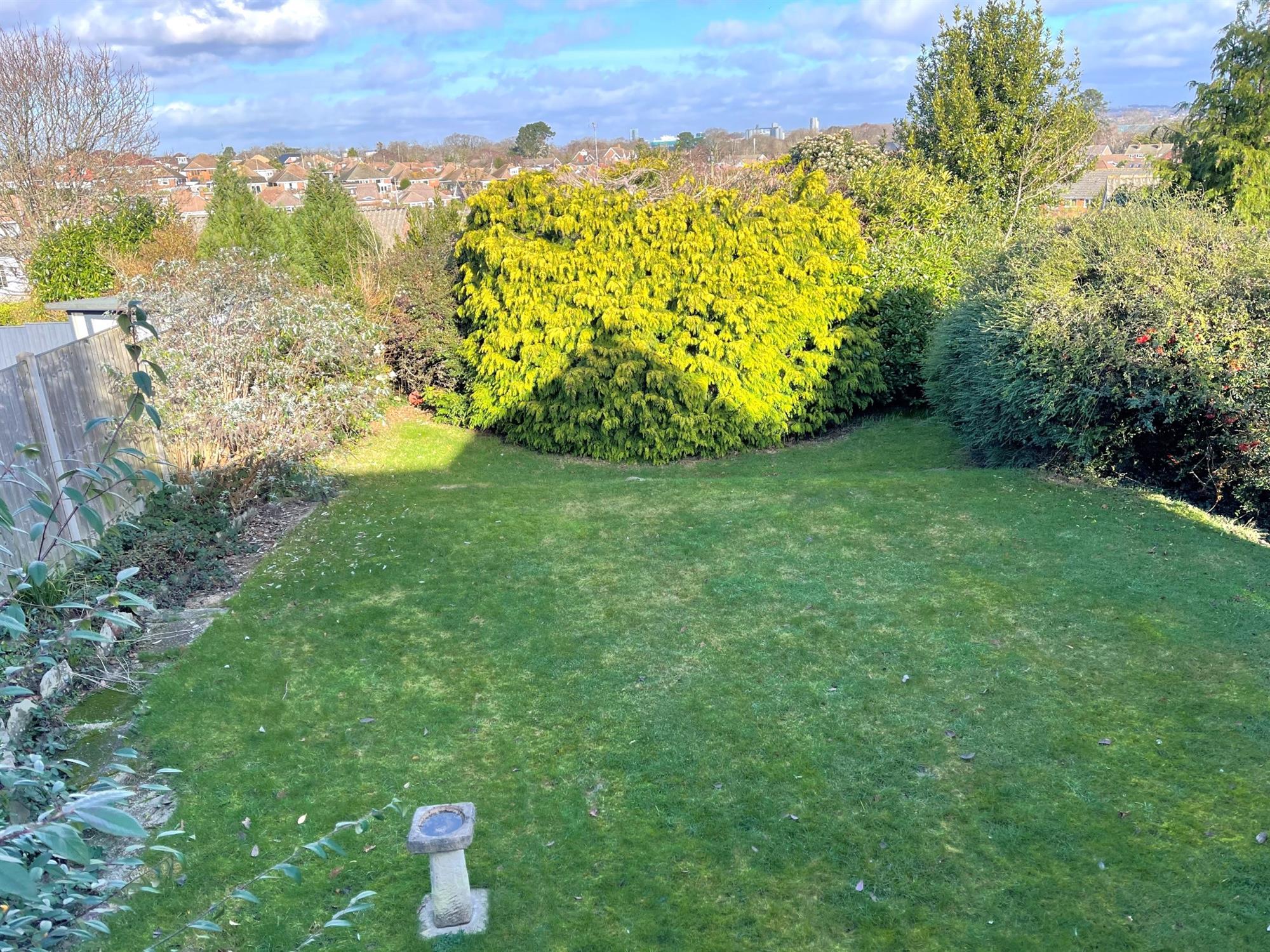 Fenced to boundaries. Decked seating area with views of Southampton Water and steps down to garden. Mainly laid to lawn with mature shrubs and bushes. Doors to storage areas.