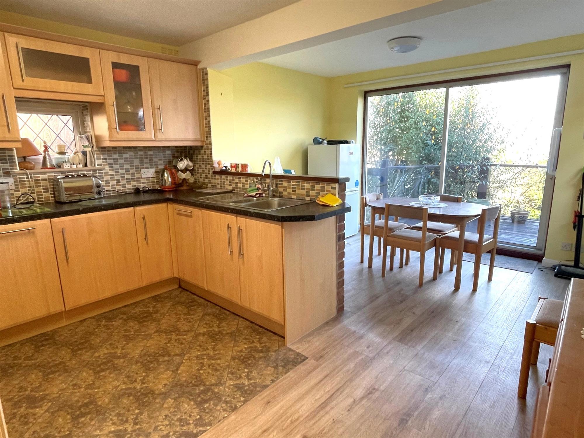 Window to side. Space and plumbing for washing machine and tumble dryer. Radiator. Sliding patio doors onto decking.