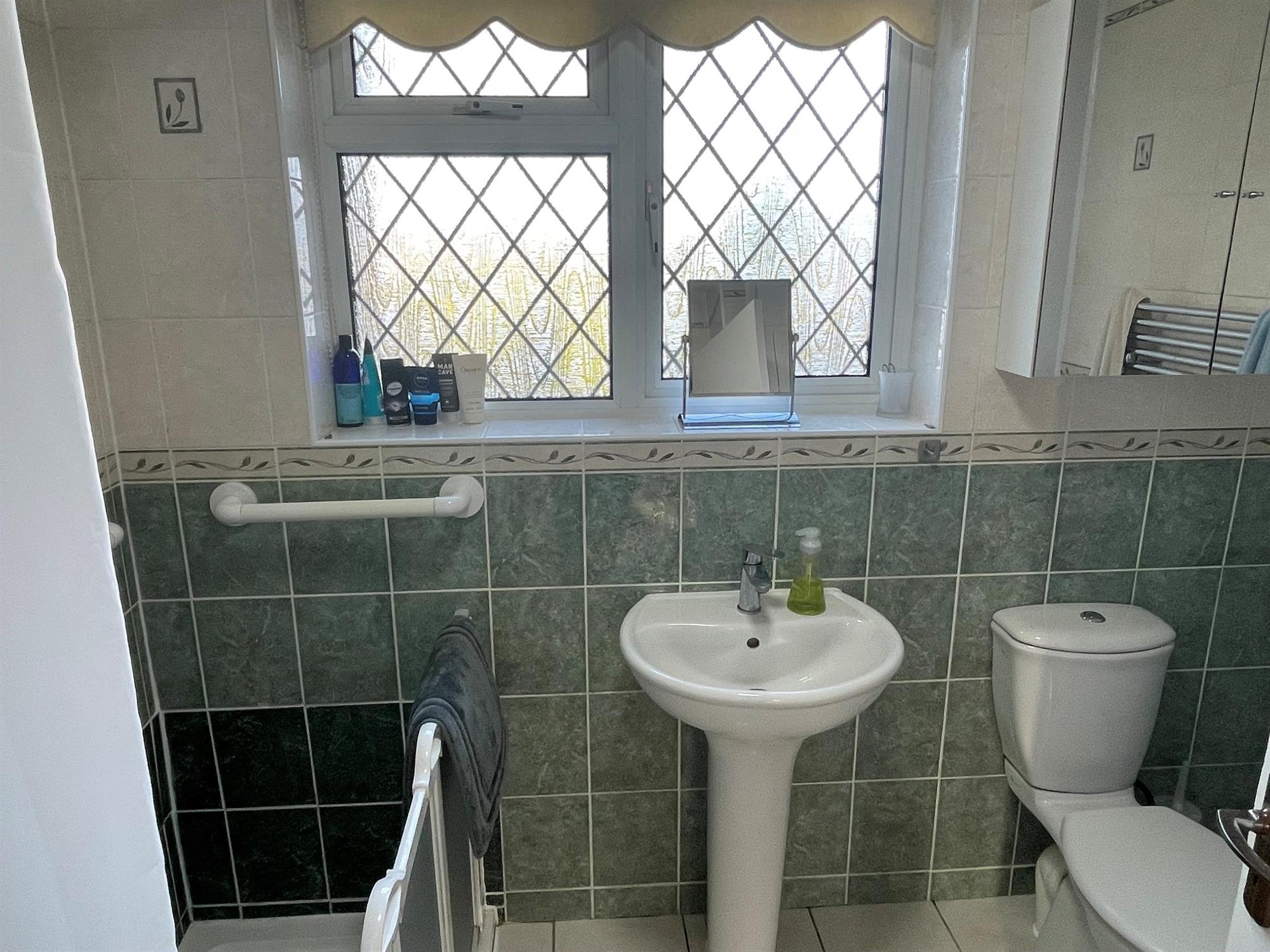 Window to rear. Low level WC. Pedestal wash hand basin. Walk-in shower. Built in cupboard. Heated towel radiator.