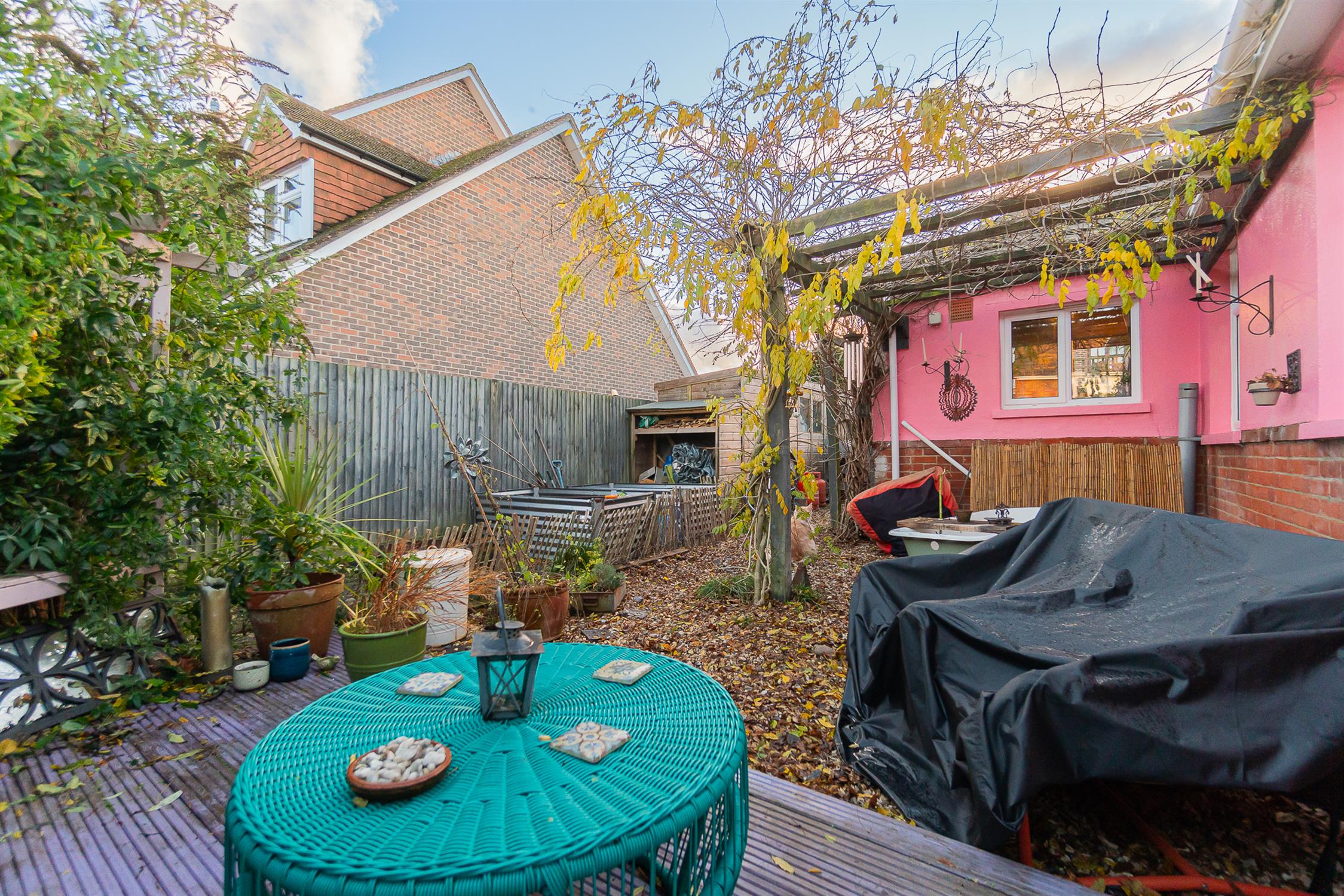 The wrap-around gardens offer several options for enjoying the exterior of this property. There is decking to the rear of the property with an outside bath under a Wysteria covered pergola. Veg patch for the green-fingered gardeners and ample storage provided by the good-sized shed. At the front of the property there is enough driveway for up to 3 cars and lawns.