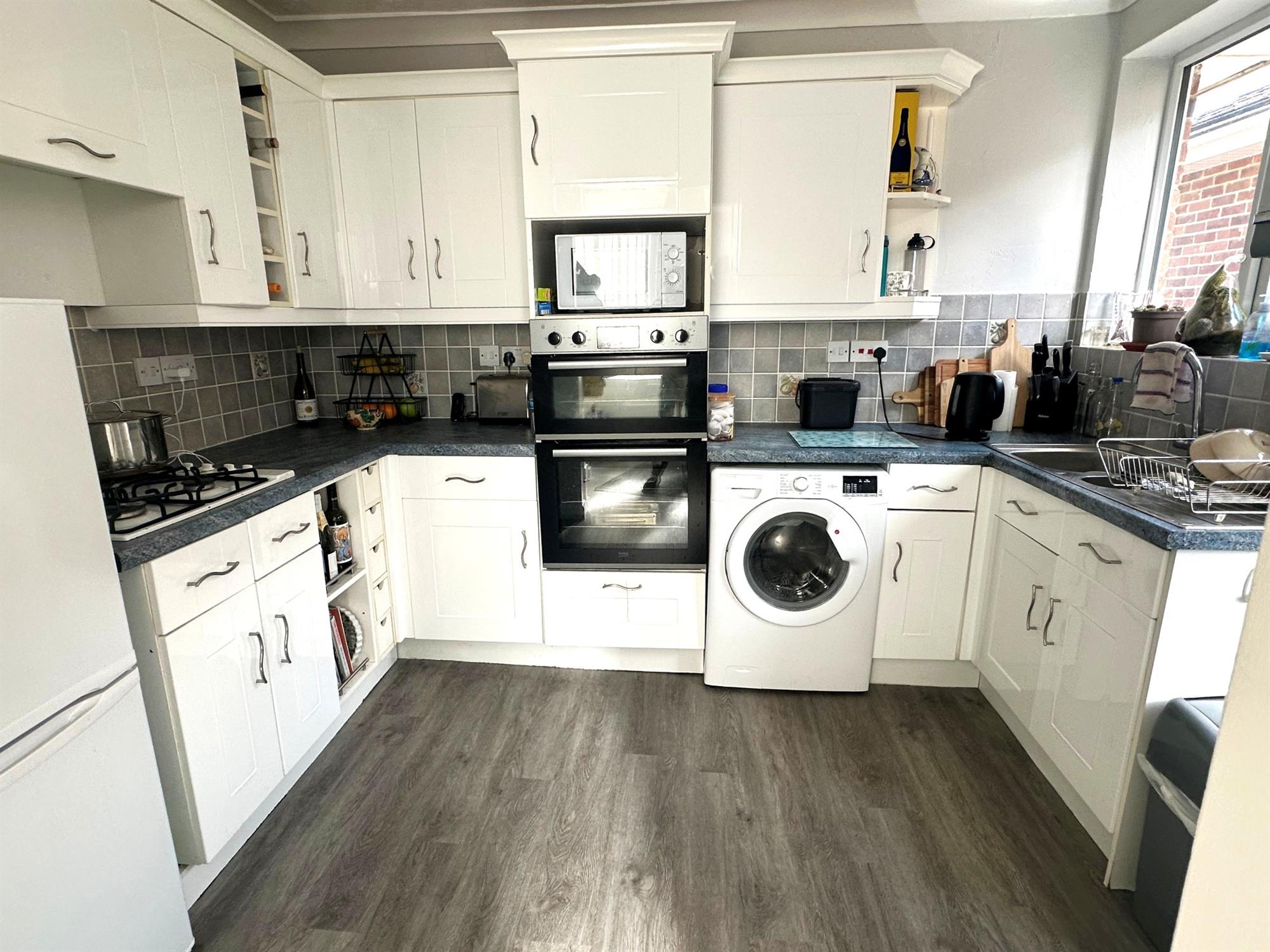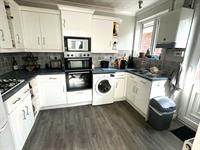Fitted with a comprehensive range of base and wall units with working surfaces over and complementary tiling to splashbacks. One and a half bowl stainless steel sink unit with mixer taps. Inset gas hob with extractor hood over. Built-in oven and microwave. Space and plumbing for washing machine. Space for fridge.