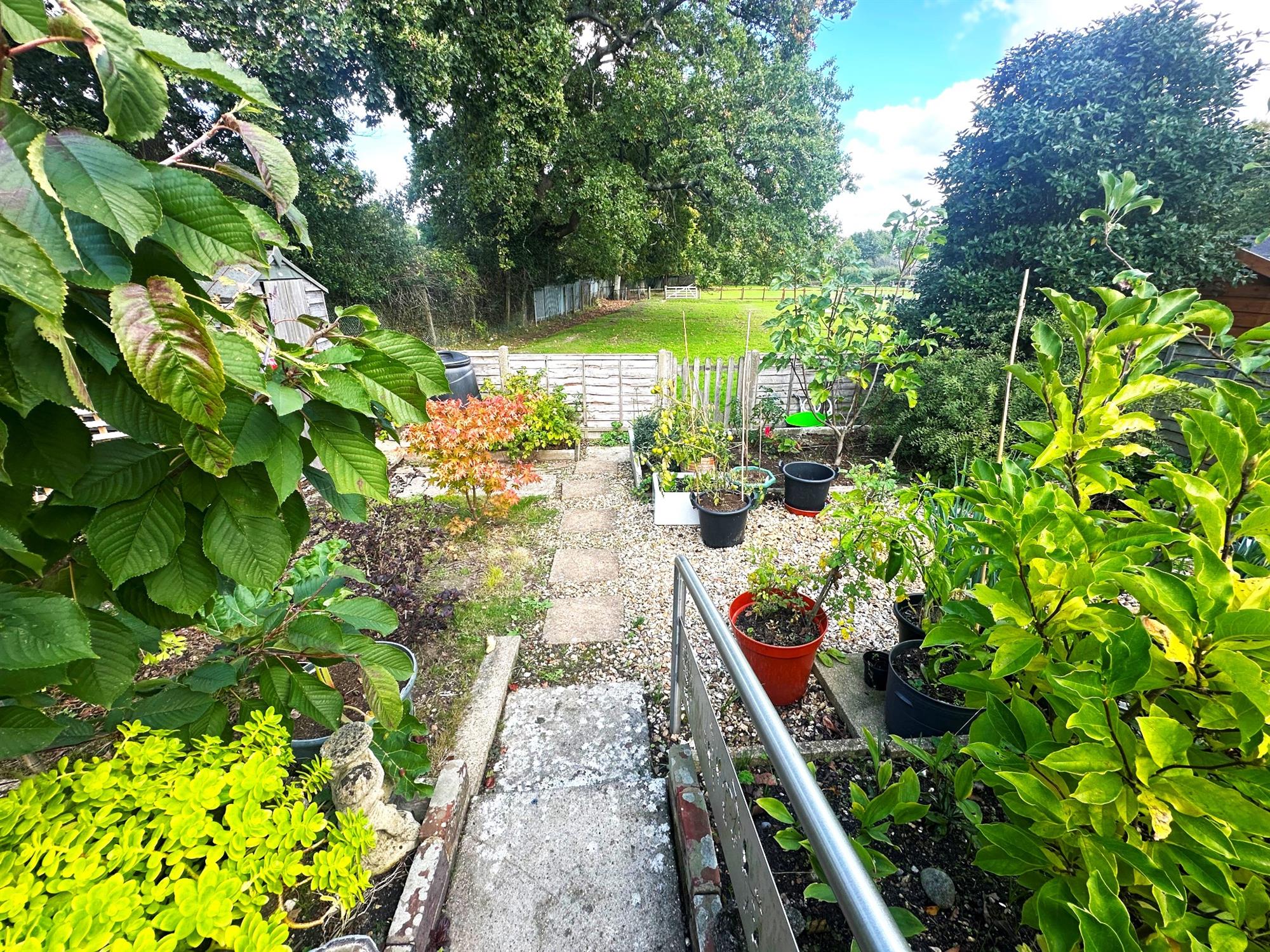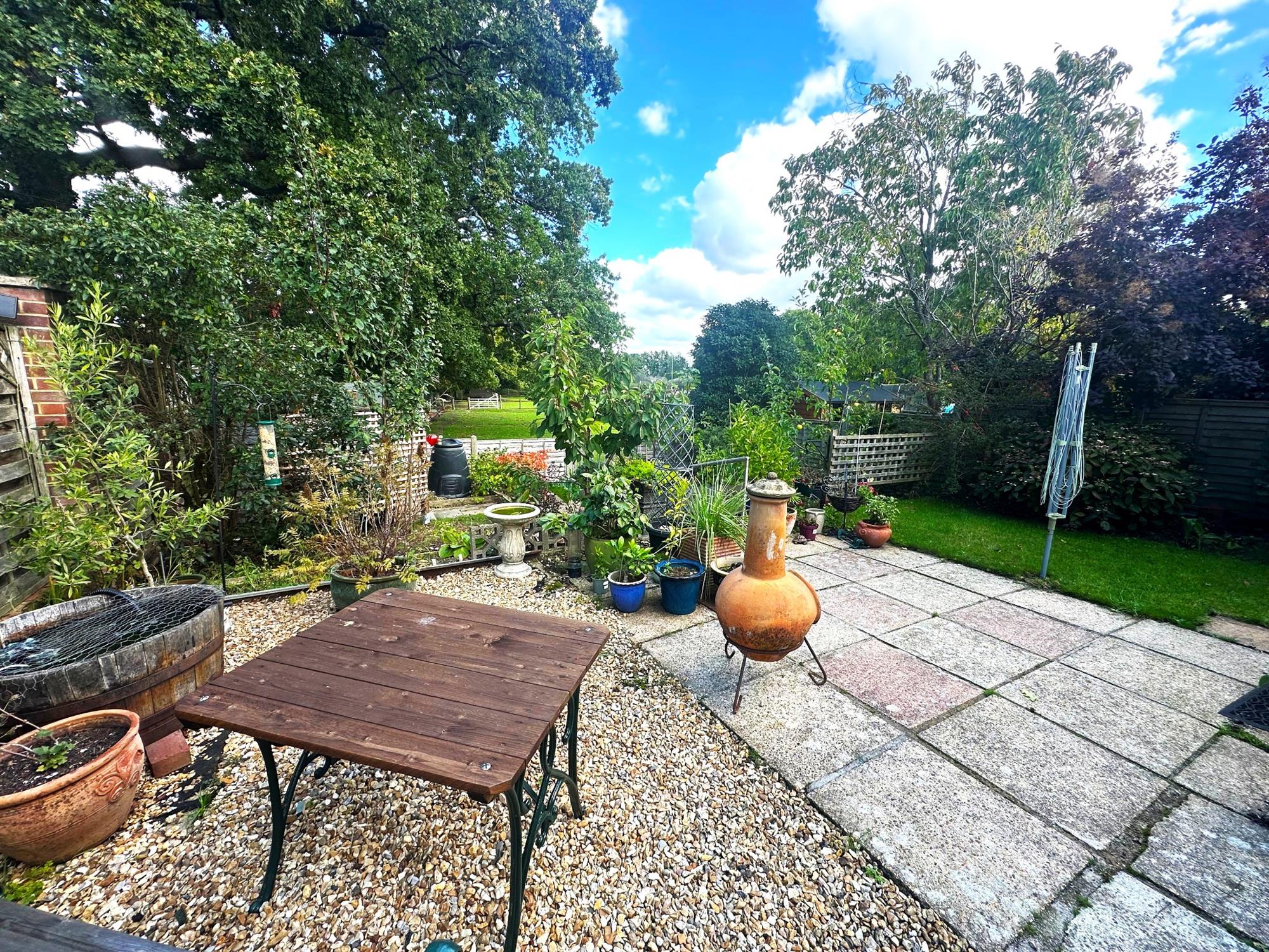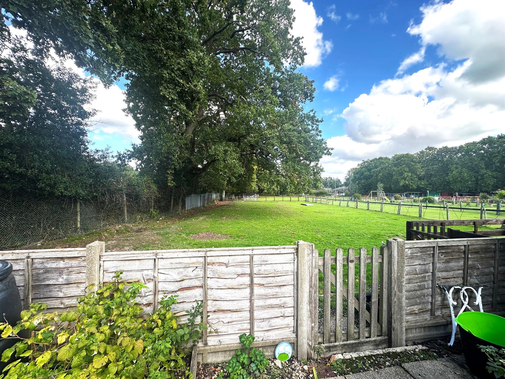 Fenced to boundaries. Laid to lawn. Patio area. Well stocked flower beds. Overlooking fields.
