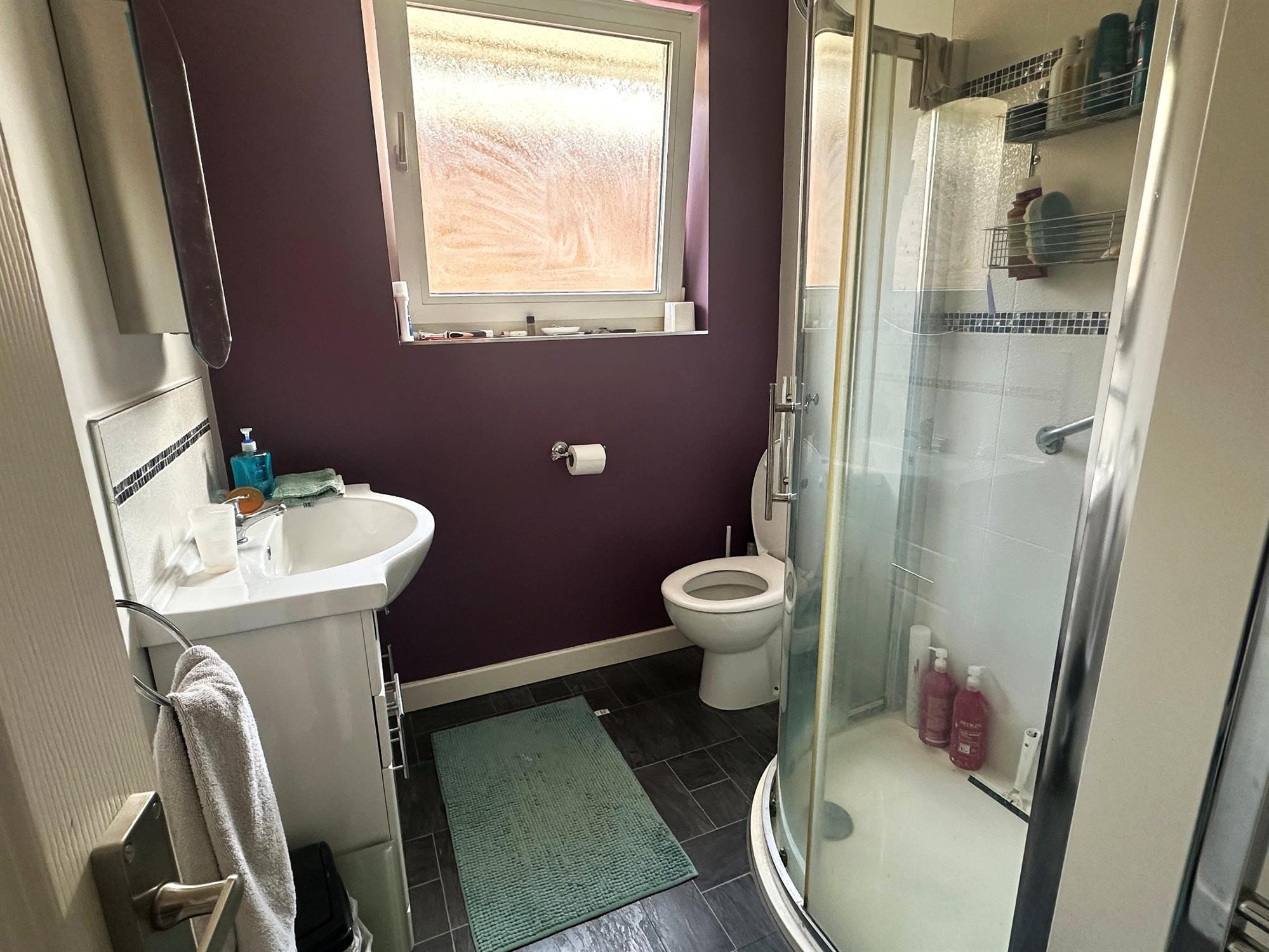 UPVC obscure glazed window to the side. Refitted fully tiled shower cubicle. Close coupled WC. Wash hand basin with built-in cupboards below. Complementary tiling.