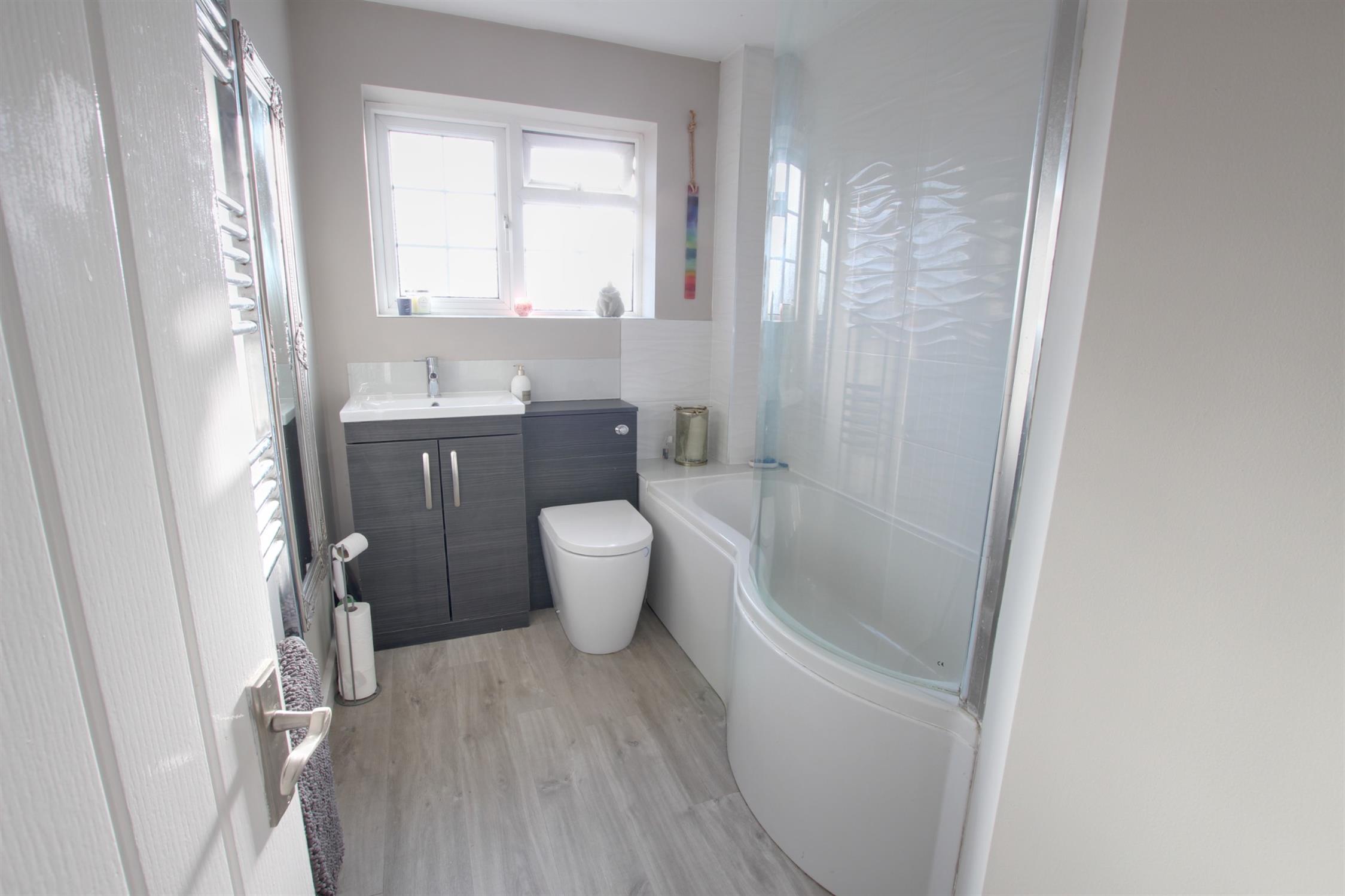 'P' shaped bath with independent shower over. Shower screen. Low level W.C. Hand basin. Part tiled walls. Ladder style radiator. Obscured double glazed window to rear.
