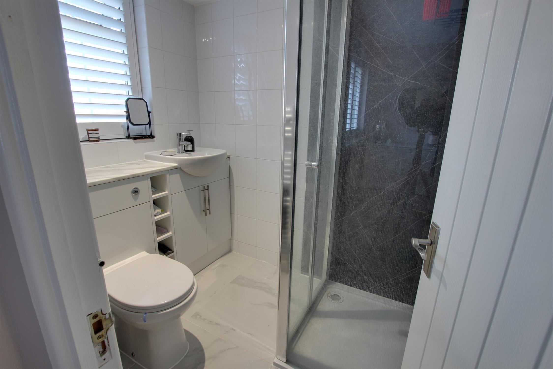 Fully tiled walls. Step in shower cubicle. Low level W.C. Hand basin. Shaver point. Ladder style radiator. Tiled floor. Obscured double glazed window to front.