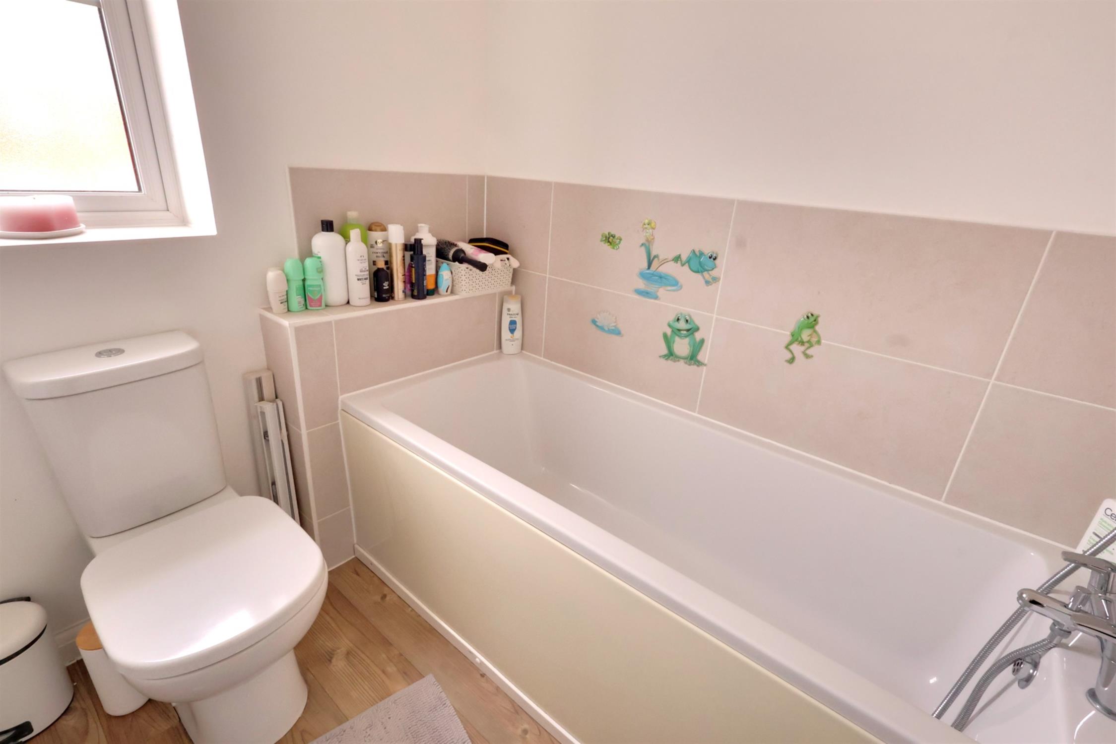 Obscured double glazed window to the rear elevation, bath with splashback surround, dual flush WC and wash basin with tiled splashbacks, extractor fan.